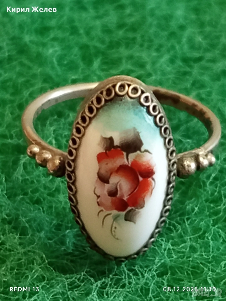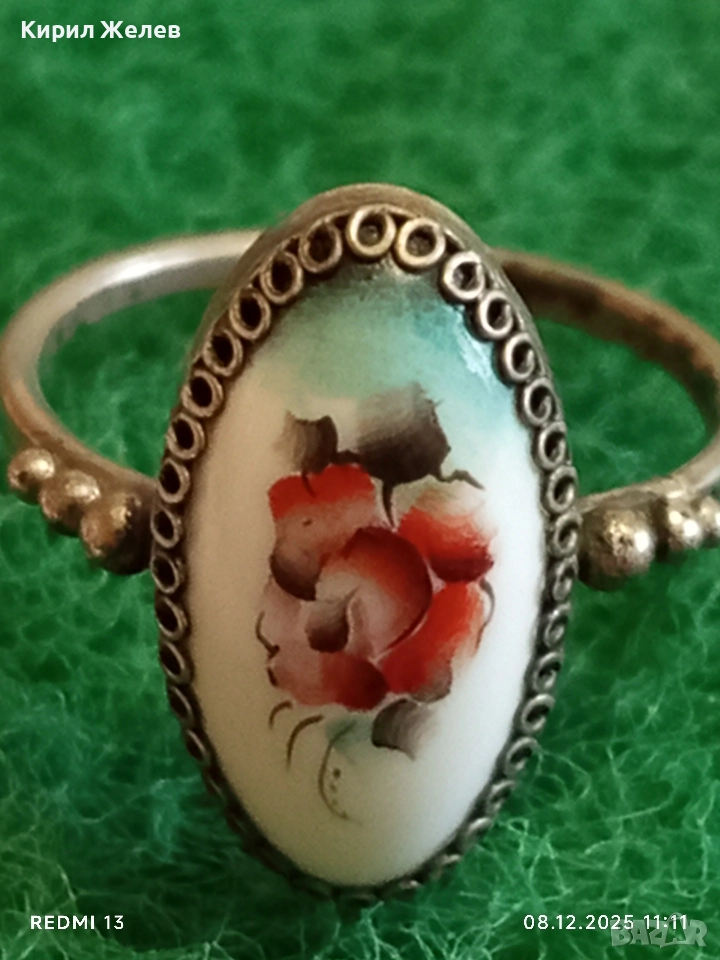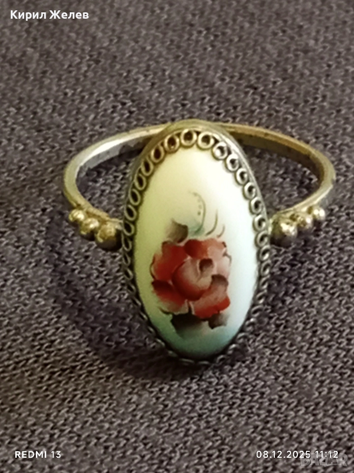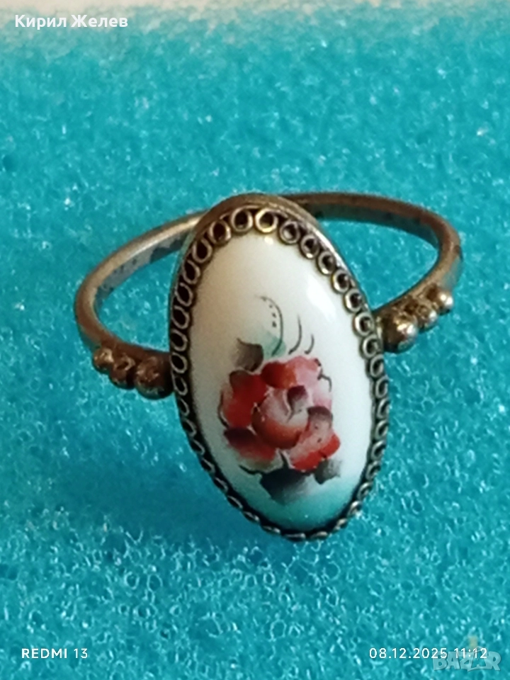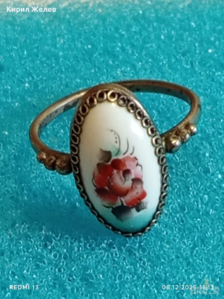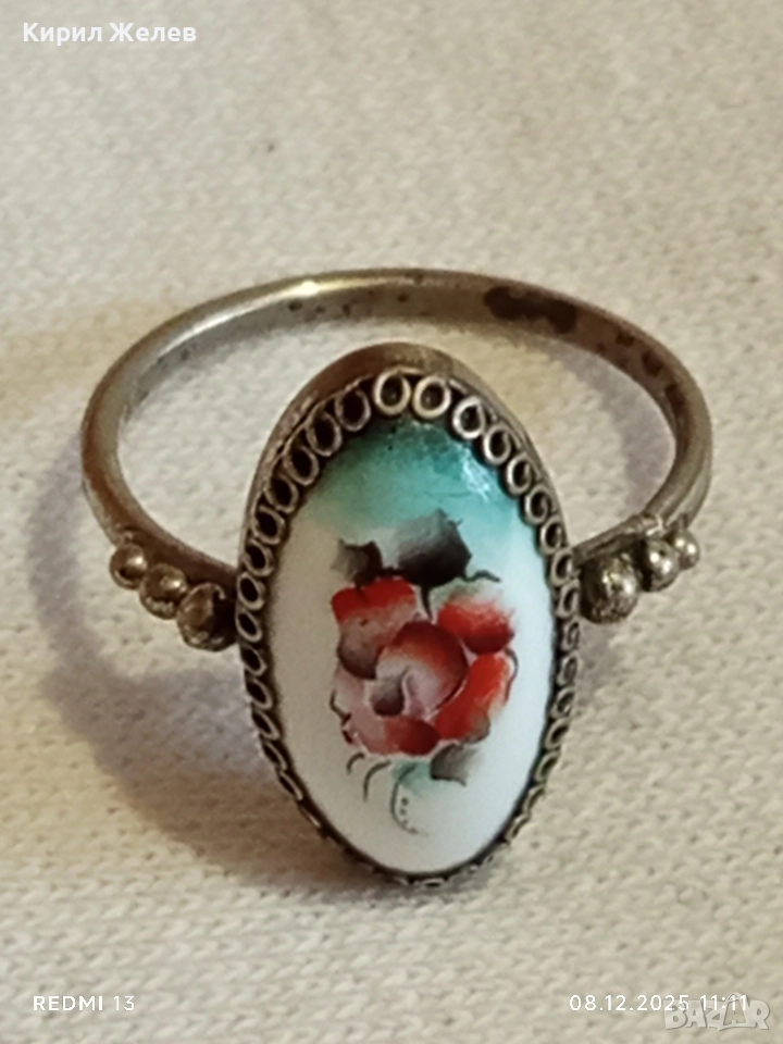 Винтидж сребърен пръстен с филигран и ръчно рисувана роза върху емайл 52426