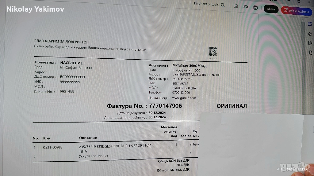 Продавам 2бр. практически нови BRIDGESTONE DUELER H/P SPORT DOT 2022 235/55 R19 101V. Гумите са на не повече от 3 000 км, закупени са през януари 25-та година и са с две години гаранция към gumi7.com. Налична фактура. Made in Japan. Продават се поради смяна на размера. Цената е за 2бр.