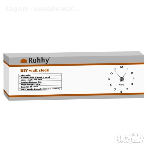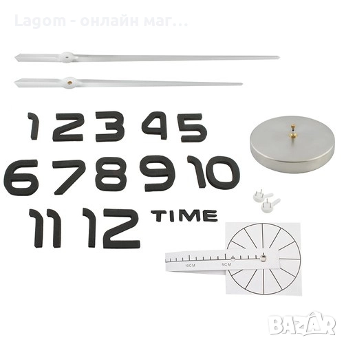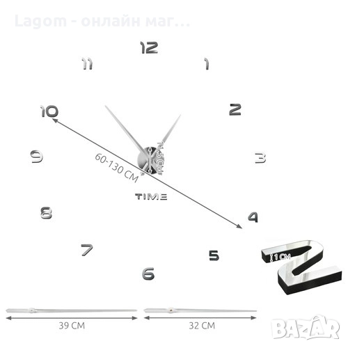 - СПЕЦИФИКАЦИЯ - цвят: сребрист; материал: EVA пяна + акрил, други: ABS + неръждаема стомана + желязо + хартия; дължина на стрелките: 39 + 32 cm; дебелина на цифрите: 1 cm; височина на цифрите: 7-8 cm; диаметър: 60-130 см; захранване: 1 x AA батерия (не е включена); тегло на комплекта: 265 г; тегло с опаковката: 365 г.