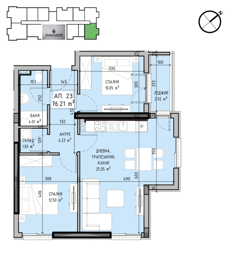 Разпределение: антре /6.23 кв.м./, дневна с кухненски бокс /25.05 кв.м./, спалня /12.50 кв.м./, втора спалня /10.05 кв.м./ баня с тоалетна /4.01 кв.м./, складово помещение /1,83 кв.м./ и лоджия /2.92 кв.м./.