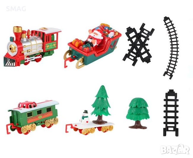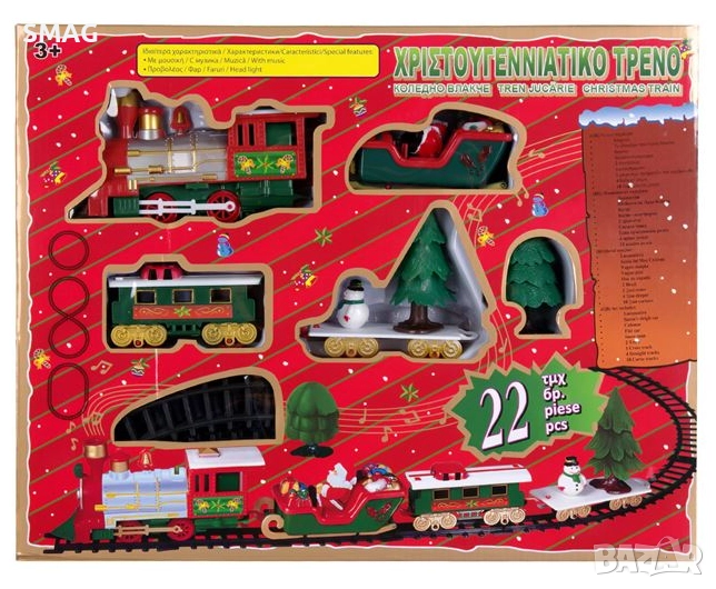 Брой/Комплект: 22 части, включително локомотив, вагони, шейна, елхи, снежен човек, прави и извити релси