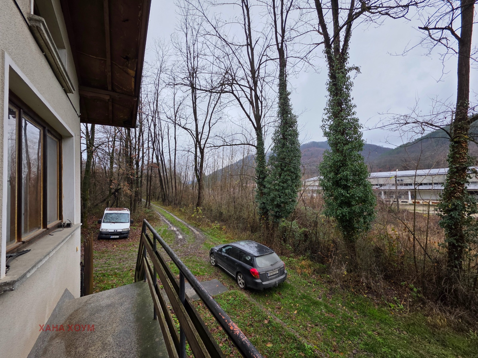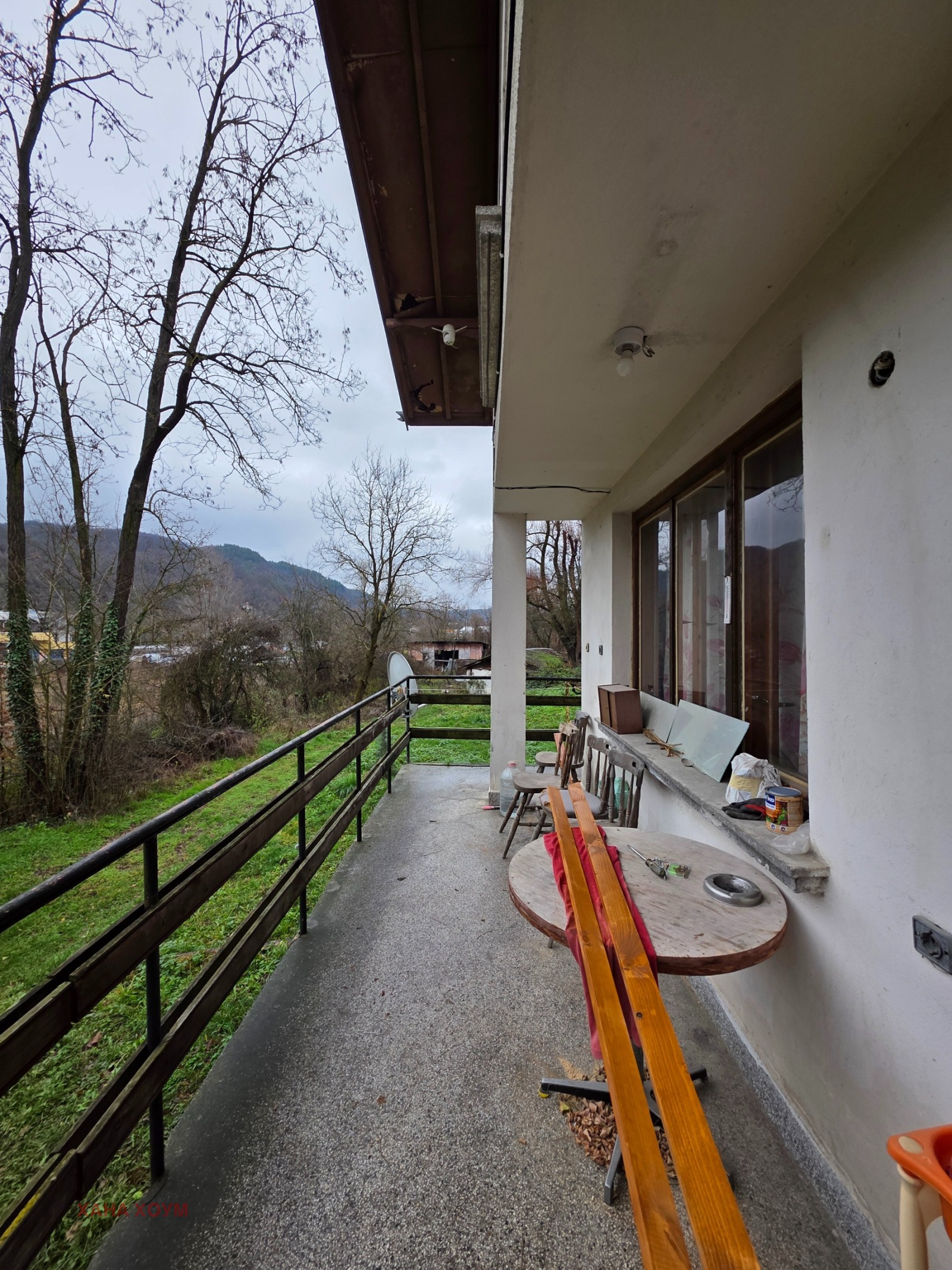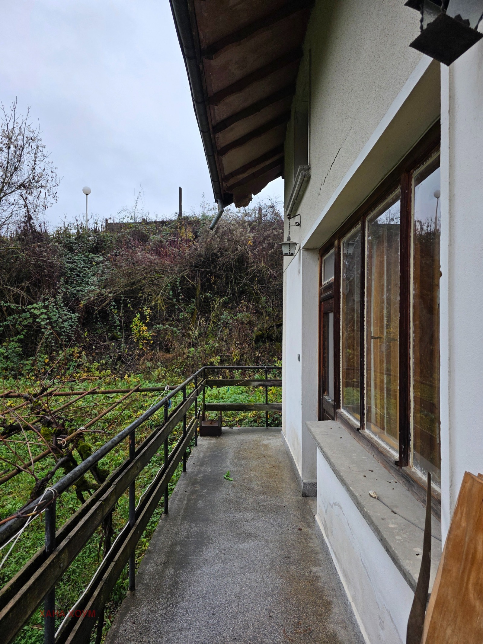 (Стълбището за подпокривното пространство е външно, метално и се намира на гърба на къщата).