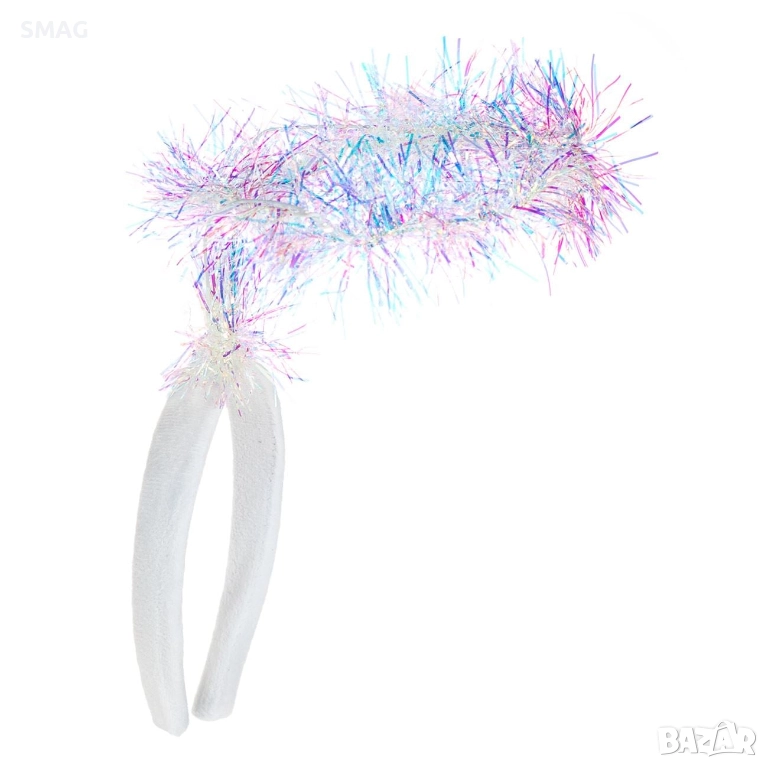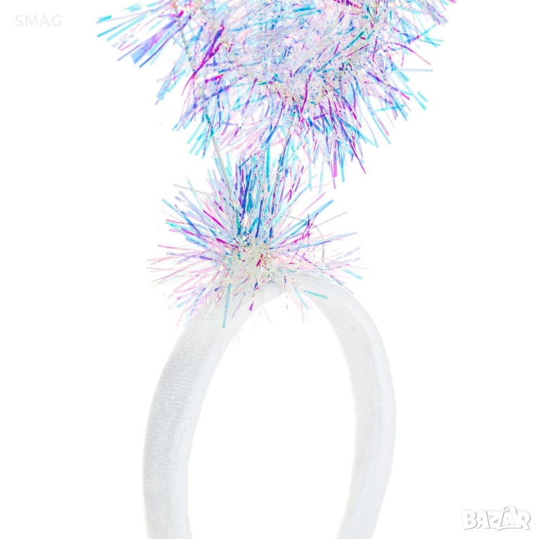 Елегантна коледна диадема с мека кадифена текстура в бял цвят и холографски ореол, който създава празничен ефект. Подходяща за коледни партита, тържества, карнавали и тематични събития. Лека и удобна за носене, придава завършен и игрив акцент към празничната визия.