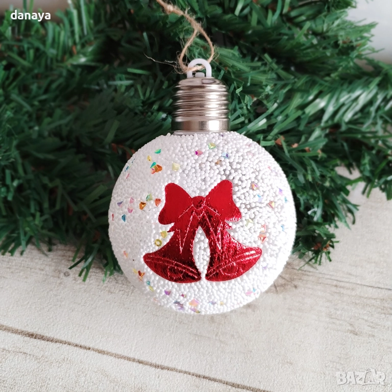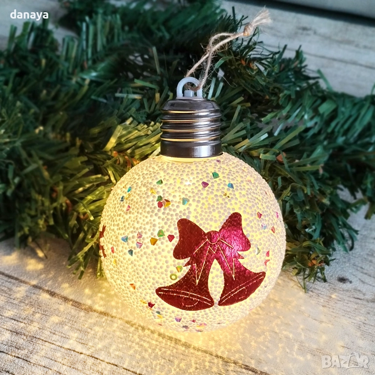 Светещата коледна топка за елха 8 см е ефектна LED декорация, която добавя топлина, уют и празничен блясък към всяко пространство. Повърхността е релефна, покрита с микроперли и цветни декоративни частици, а червените камбанки отпред създават класическа коледна визия, която веднага привлича вниманието.