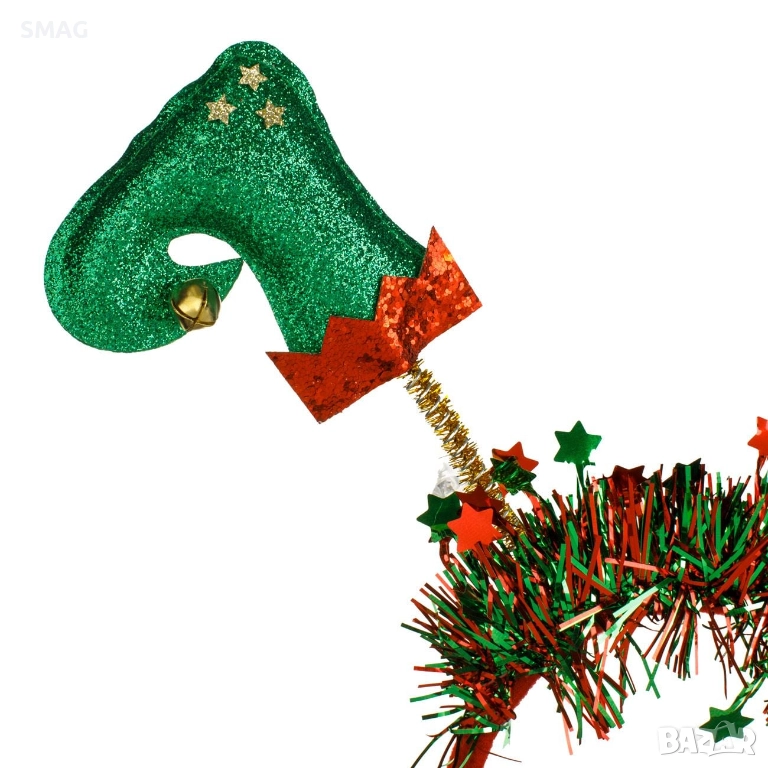 Забавна коледна диадема с крачета на елфче на пружинки, украсена с брокат, звънчета, златни звезди и декоративен tinsel в червено и зелено. Идеална за празнични партита, училищни тържества и тематични снимки. Лека и ефектна, добавя весел и игрив акцент към всяка коледна визия.