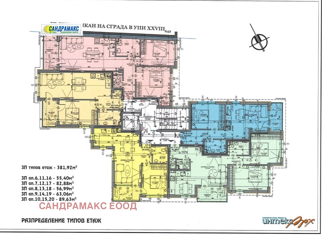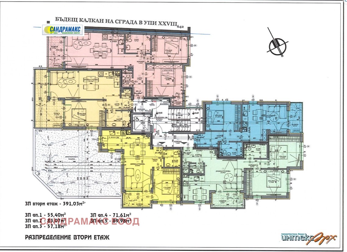 Сградата е шестетажна, с апартаменти, два магазина на партера,паркоместа,подземни и надземни гаражи. Строителството е монолитно, червена тухла, с топлоизолация.ОБЩИТЕ ЧАСТИ са луксозни и удобни, има АСАНСЬОР с автоматични врати., тераси - напълно завършени с гранитогрес, под . циментова замазка , стени и тавани - гипсова мазилка, сан. помещения - също., немска РВС дограма шесткамерна,външни врати- метални с касов ключ.ИНСТАЛАЦИИ - до тапа , водомери, електромери, контакти, осветителни фасунги, ел. табло и ел. ключове, извод за домофонна уредба, ТВ извод за антени. Отопление - на ток.В сградата има и други тристайни апартаменти на разни етажи за продажба, също и мезонет,,ПАРКОМЕСТА И ГАРАЖИ. АПАРТАМЕНТИТЕ имат мазета , балкони. изложение.Цените са без ДДС .Горепосоченият апартамент е номер 5 на втори етаж, непреходен, изложение- изток/ запад.