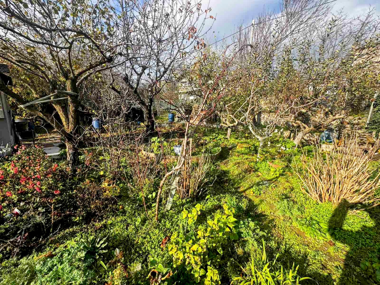 Дворът с площ от 780 кв.м предлага усещане за простор и зеленина, подходящ за семейни събирания, отдих или градинарство. В имота има овошки и лозе, които допринасят за естествената, поддържана атмосфера.