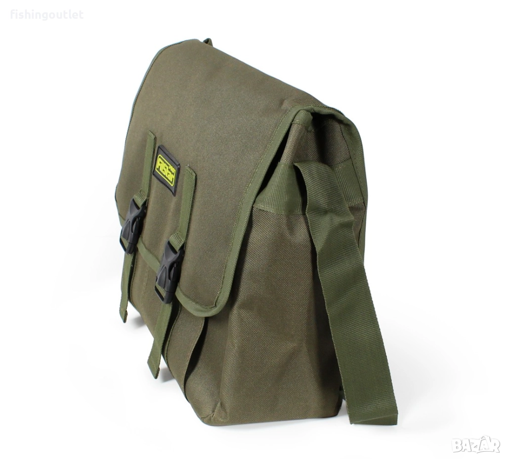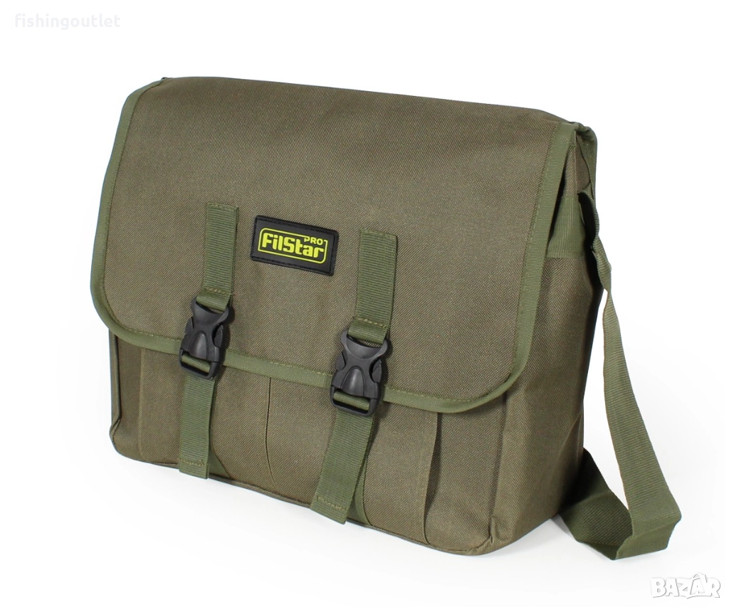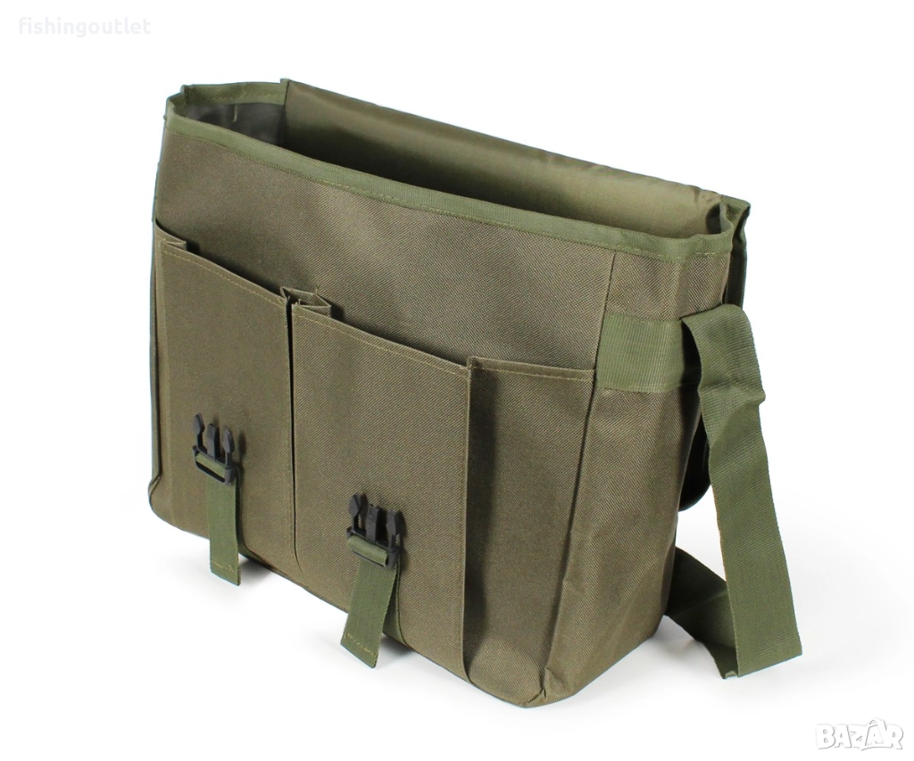 Универсална чанта за риболов с класически дизайн за носене през рамо. Изработена е от здрава полиестерна материя и е снабдена с водоустойчива винилова облицовка в предната си част и на дъното. Основното отделение ви осигурява широко пространство за съхранение, а двата предни джоба са отлични за инструменти и принадлежности с нужда от бърз достъп. Разполага още с регулируема презрамка и голям капак, затварящ се с две пристягащи се клик-катарами.