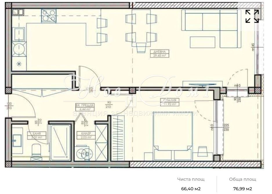 Обща Площ: 76.99 м² (Чиста Площ: 66.40 м²)