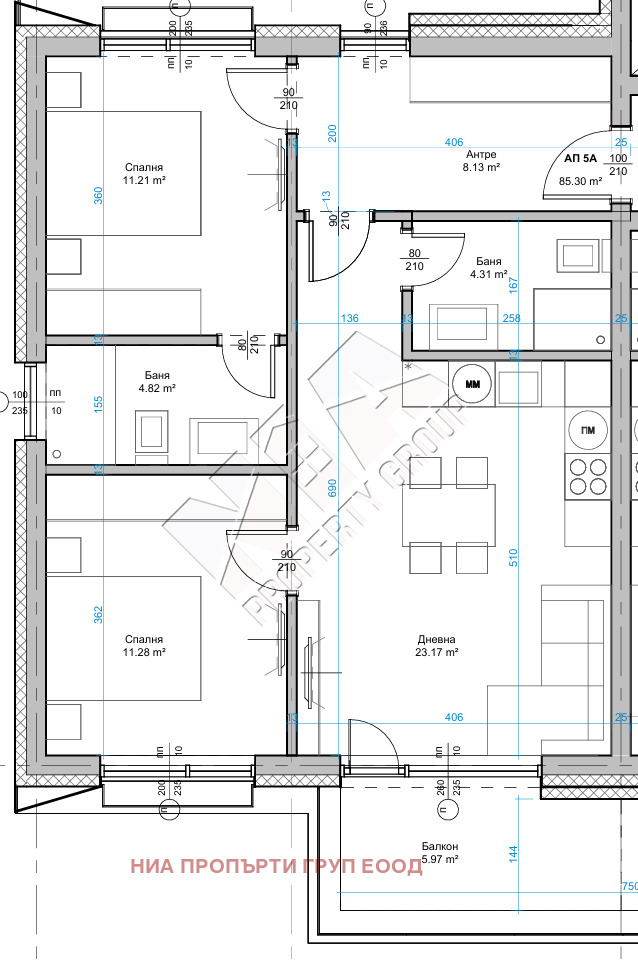 Апартамент с две спални и две бани с чиста площ 97.82кв.м., намиращ се на 3- ти жилищен етаж/не последен/.