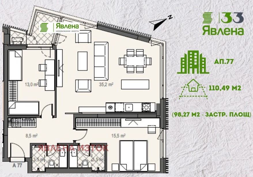 Явлена Изток представя уютен двустаен апартамент, разположен в елегантна, модерна сграда в непосредствена близост до бул. Тодор Каблешков. Жилището впечатлява с функционално и добре премислено разпределение, което създава усещане за простор и хармония. Сградата се изгражда с висококачествени материали, подбрани с внимание към детайла: масивни външни стени от керамични тухли Wienerberger Porotherm (25 см), ефективна фасадна система BAUMIT с 12 см топлоизолация, алуминиева дограма от висок клас с троен стъклопакет, осигуряваща отлична енергийна ефективност, тишина и дълготрайност. Отоплението е подово, на газ, с изградени разводки за газово котле и климатици гаранция за максимален комфорт през всички сезони. Към апартамента може да бъде закупен подземен гараж или паркомясто. Сградата ще бъде завършена и въведена в експлоатация в средата на 2027 г., предоставяйки възможност за инвестиция в бъдещ дом с висока стойност и престижно местоположение.