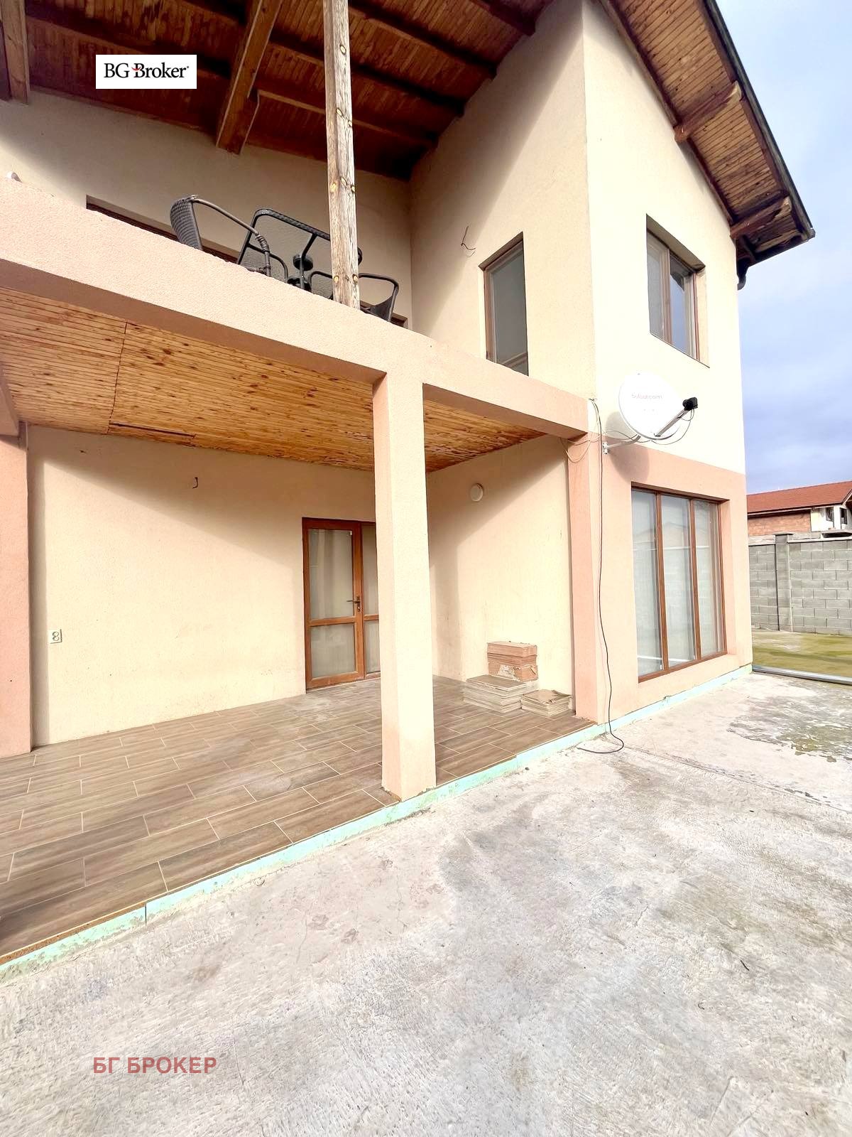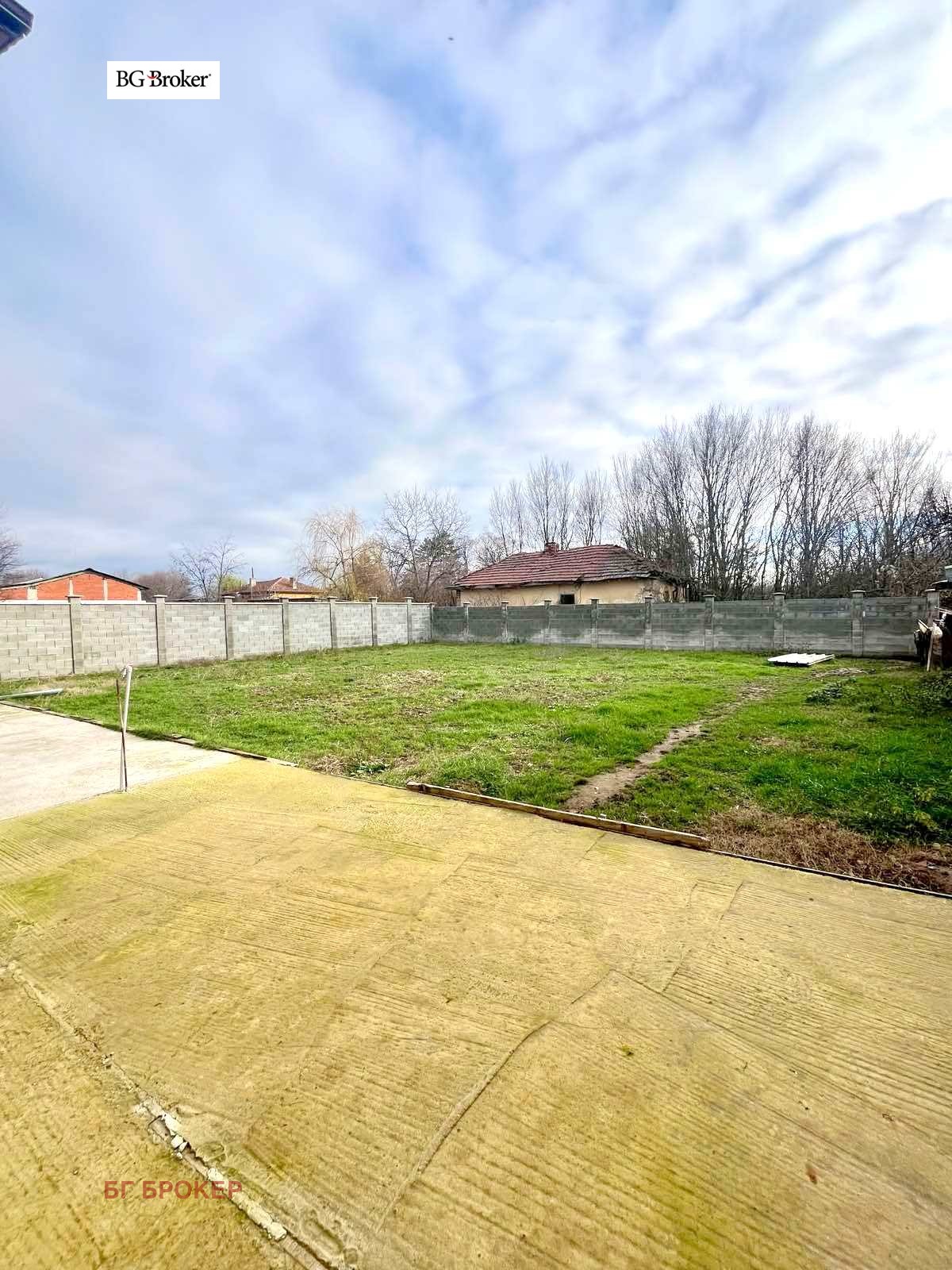 Дворът в предната част е с бетонова настилка, а задната част е с тревна площ.