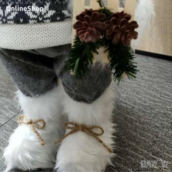 Мек сив костюм с бели акценти, топъл пуловер с орнаменти и пухкави ботушки. Ръчно изработените детайли – фенерът, подаръчната торба и естествените елементи от шишарки и зеленина – придават на фигурката уютен, скандинавски стил.