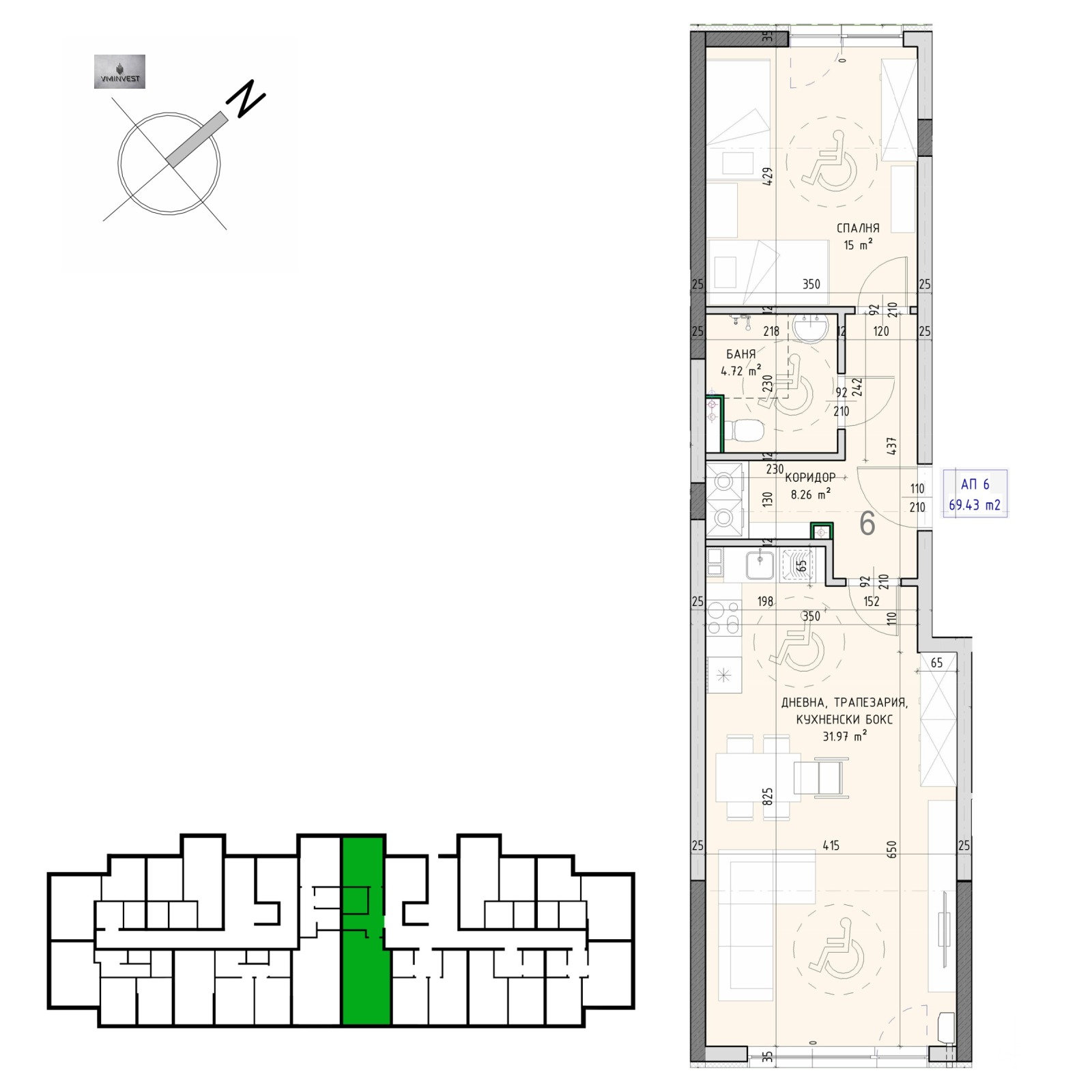 Апартаментът /Ап.6, Вх.А/ е с площ от 78,54 кв.м. и е на партерно ниво.