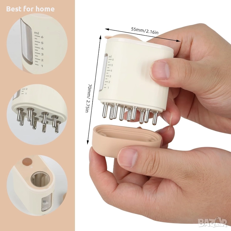 【Прозрачна скала и водоустойчивост Масажорът за скалп е с кутия за съхранение от 6 мл и е маркиран с прозрачна скала, която може точно да достигне дозата от 1 мл, за да се предотврати разхищение на приложение. Електрическият масажор за скалп е водоустойчив и може да се изплакне директно след употреба.