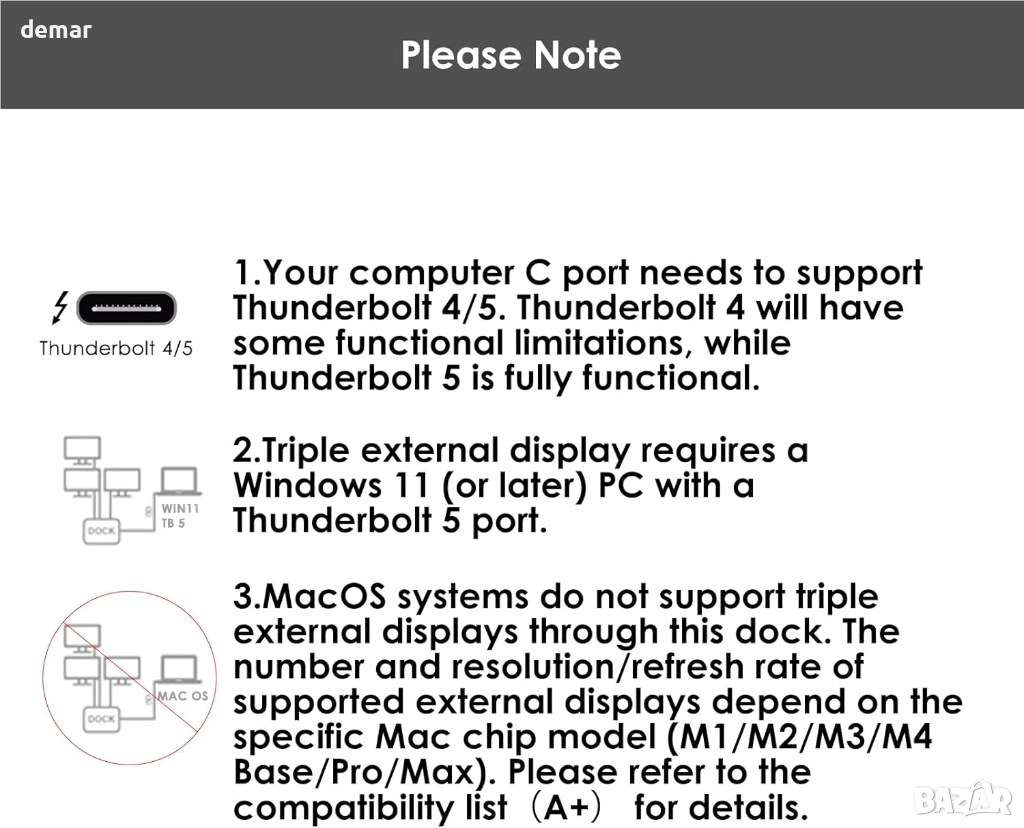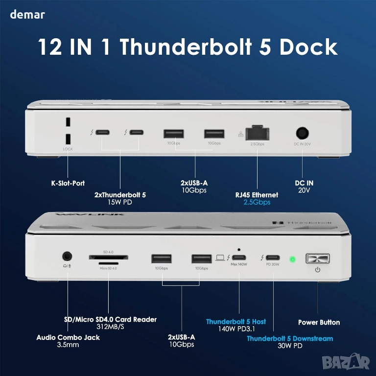 Тази 12-в-1 докинг станция Thunderbolt 5 осигурява високоскоростна свързаност с множество Thunderbolt 5 портове за бърз трансфер на данни, мощно зареждане на устройства и поддръжка за до три 4K или два 8K външни дисплея, в зависимост от системата. Тя включва бърз 2.5G Ethernet, четири USB-A порта, четец на SD 4.0 карти и аудио жак, предлагайки широка конфигурация за разширение за работа или творчески задачи. Дизайнът включва слот за заключване Kensington, противоплъзгаща основа и специални USB-A портове за периферни устройства, докато downstream портовете осигуряват и допълнително захранване за свързани устройства. Съвместимостта изисква компютър с Thunderbolt 4 или 5, а възможностите на дисплея варират в зависимост от устройството.