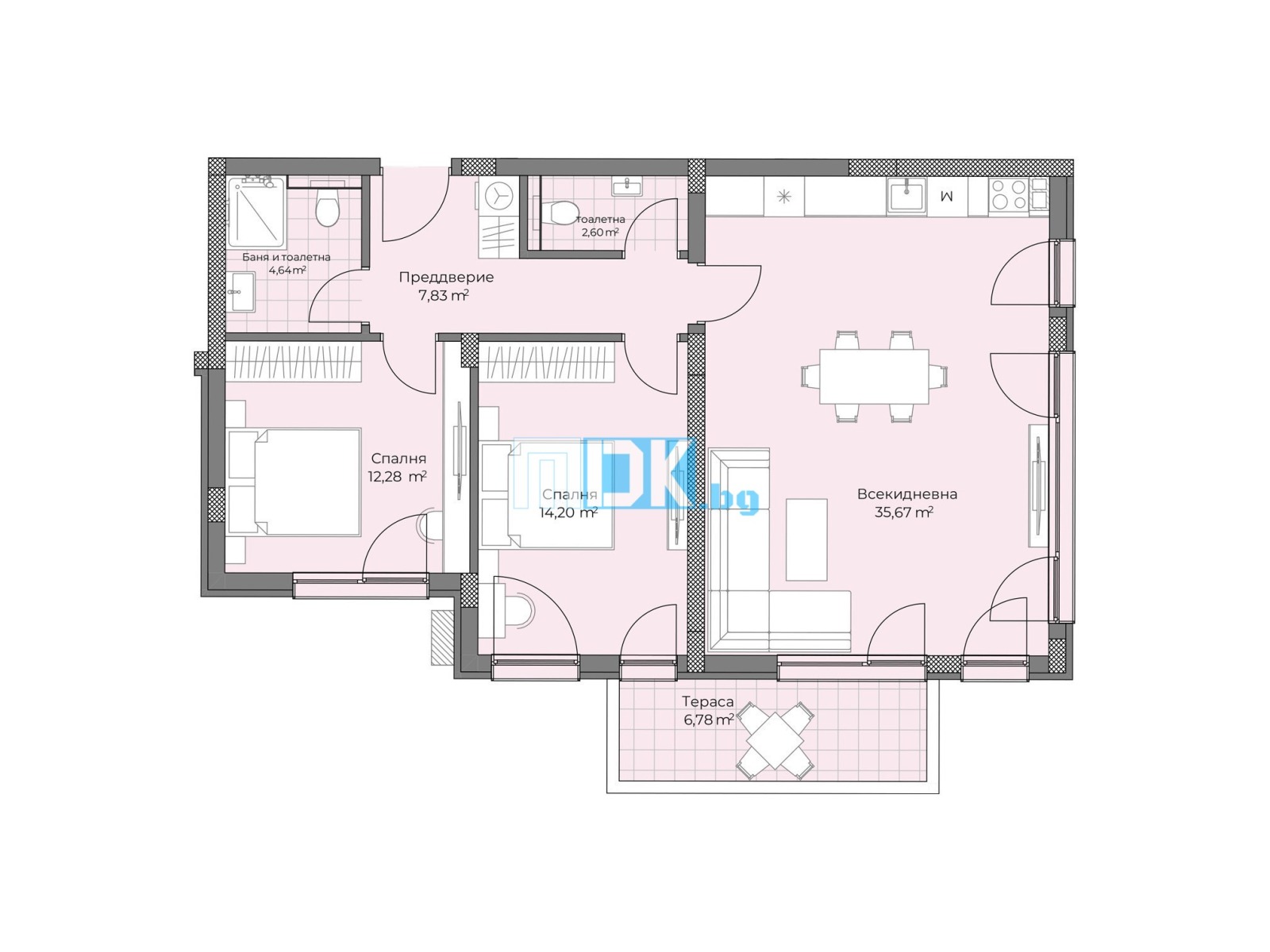 Без комисионна: 3-стаен, чудесно проектиран апартамент с големи, светли стаи хол с 2 изложения над 35 кв.м., 2 спални 14 и 12 кв.м., 2 санитарни помещения, хубава тераса с излаз от 2 от стаите и просторно антре с място за перално и гардеробна. Издава се на фина шпакловка и циментова замазка, висок клас дограми, окабеляване за телевизия и имтернет, домофонна система, ел. и ВиК инсталации, възможност за поставяне на подово отопление, изводи за климатици, изцяло довършени тераси.