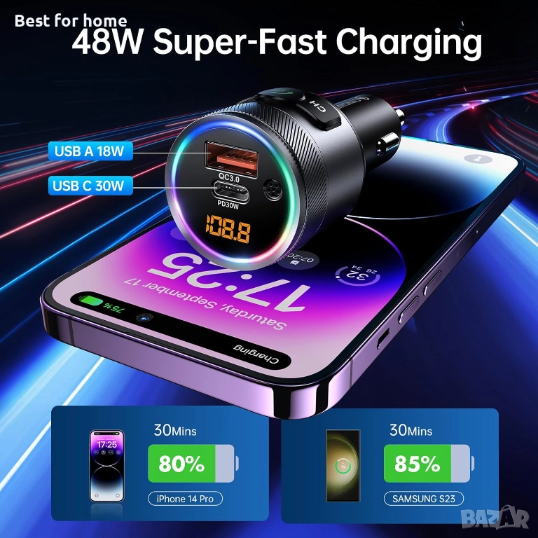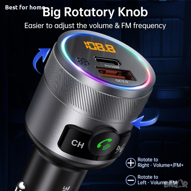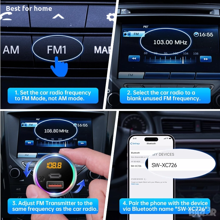 【Широка съвместимост】Този автомобилен FM Bluetooth предавател може да се използва с всяко Bluetooth устройство, като iPhone, iPad, iPod, Samsung Galaxy, Sony, MP3 плейър, таблет и други Android смартфони. Подходящ е за автомобили и камиони 12V-24V.