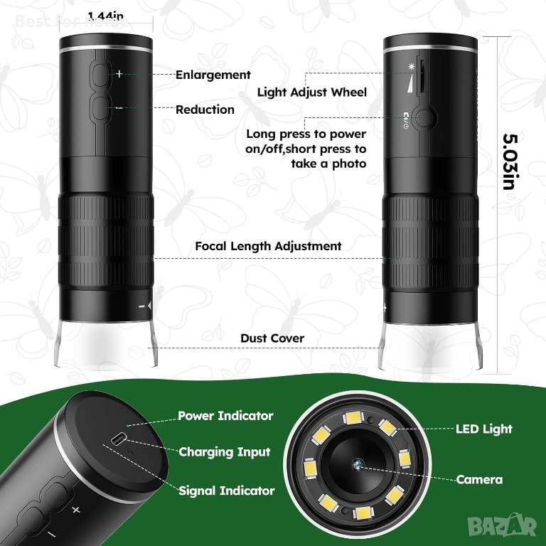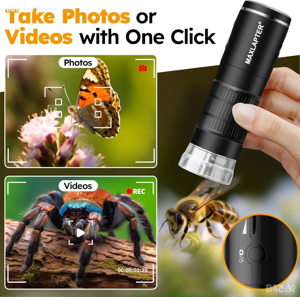 Снимка или видео с едно докосване: Можете да правите снимки или видеоклипове на вашите наблюдения и да ги запазвате на мобилния си телефон чрез бутона на преносимия микроскоп или бутона на приложението. Освен това, можете да увеличавате мащаба 1.2X/1.4X/1.6X/1.8X/2.0X на телефона си чрез бутоните за приближаване и отдалечаване на цифровия микроскоп. (Само с Wi-Fi връзка). Много полезно за записване на цикъла на промяна на наблюдавания обект.