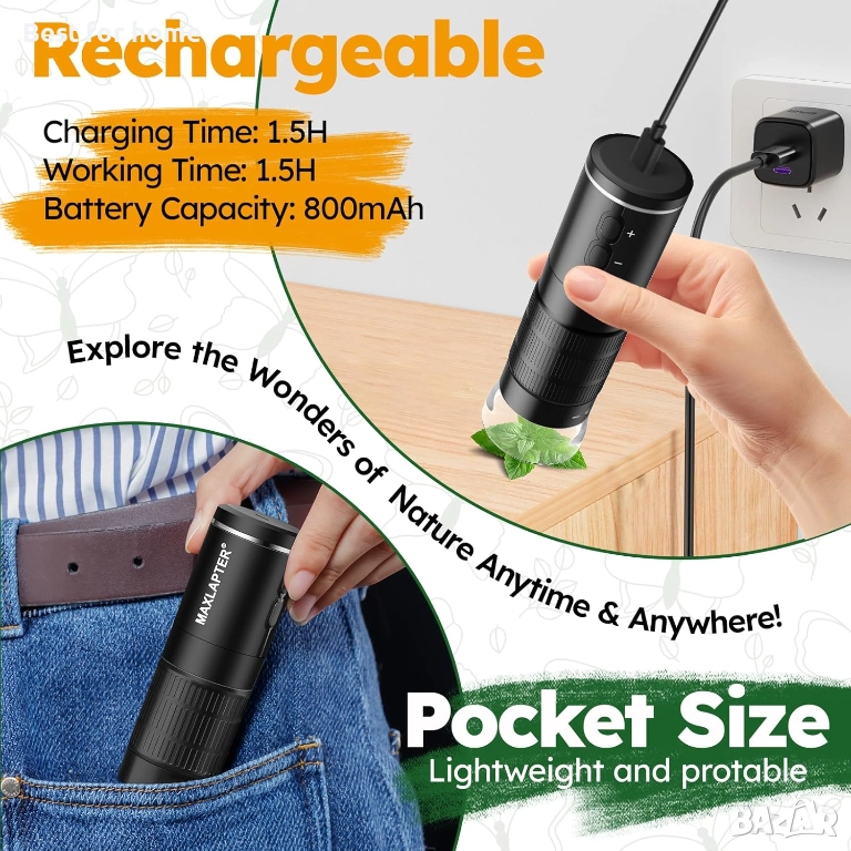 Акумулаторен и преносим мини микроскоп: Този ръчен USB дигитален микроскоп има вградена батерия 800mAh и USB презареждаем дизайн, който ви позволява да го използвате 1,5 часа с пълно зареждане. Преносим микроскоп с джобен размер, удобен за изследване на магическия и пъстър микроскопичен свят на открито или у дома.