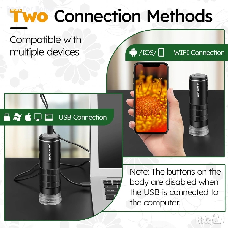 WiFi и USB микроскоп: Този безжичен ръчен цифров микроскоп с WIFI може да се свързва не само с iPhone, Android телефони, iPad и таблети, но и с компютри с Windows или Mac OS за по-голям изглед чрез USB кабел. Предоставят се приложения (следвайте ръководството за употреба).