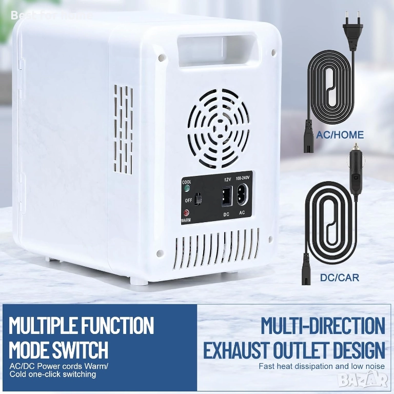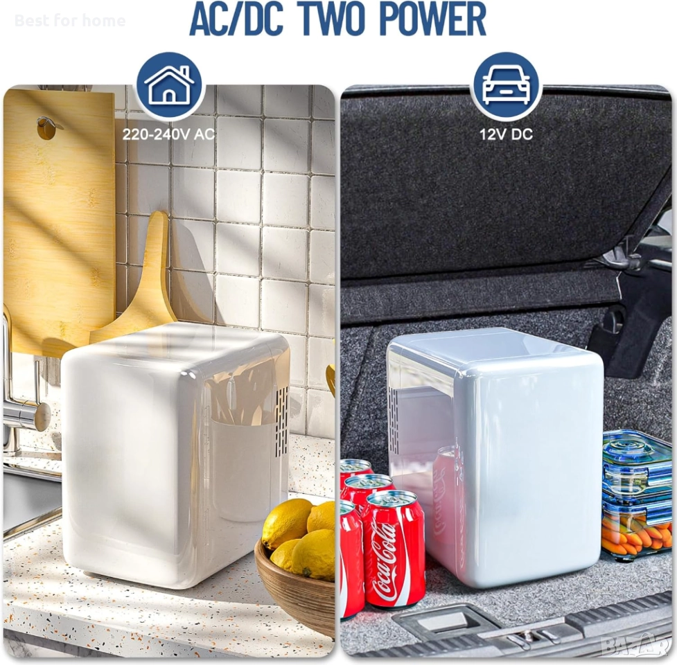 AC/DC адаптер - Включени са два щепсела. Можете да свържете компактния хладилник към 220V домакинска електрическа мрежа или 12V автомобилна електрическа мрежа, така че да можете да го използвате навсякъде у дома, в офиса, общежитието, на път, къмпинг и др. Забележка: уверете се, че хладилникът работи само когато двигателят на превозното средство работи, в противен случай акумулаторът на превозното средство може да се изтощи.