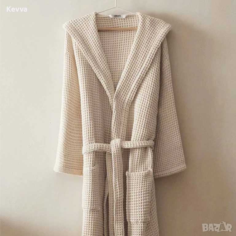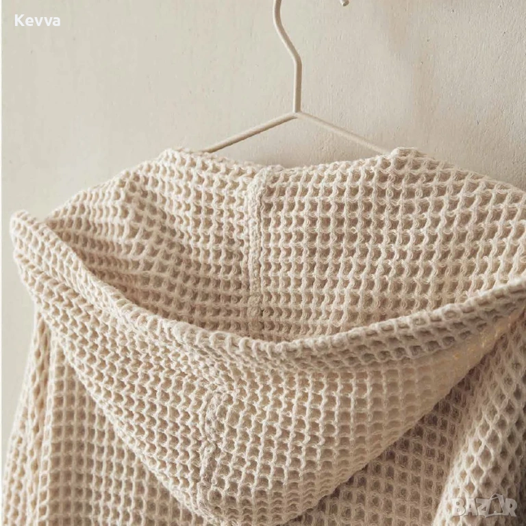 Поглезете се с нашия халат с качулка от вафелна материя, създаден за максимален комфорт и функционалност. Изработен от 100% естествен памук, той е лек, дишащ и бързосъхнещ – идеален за след баня, спа или у дома.