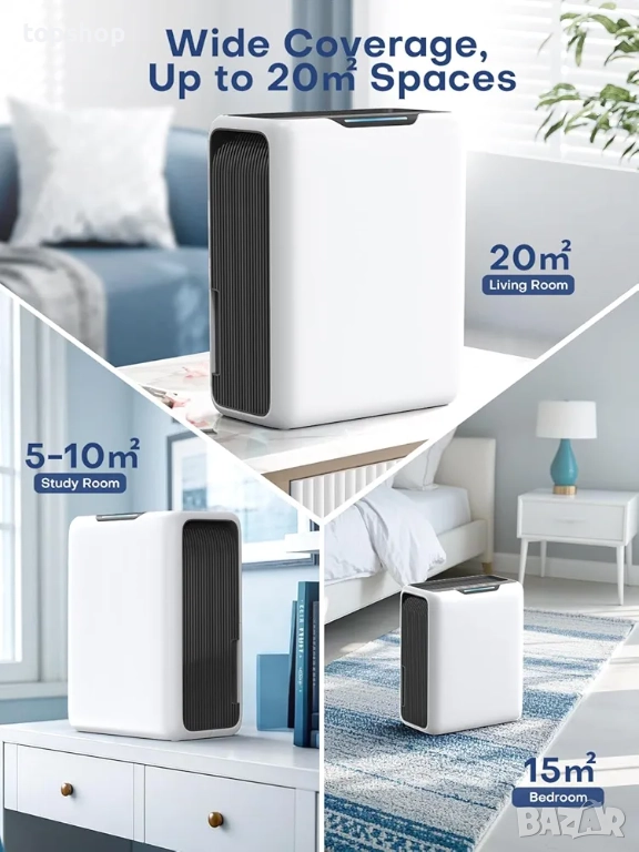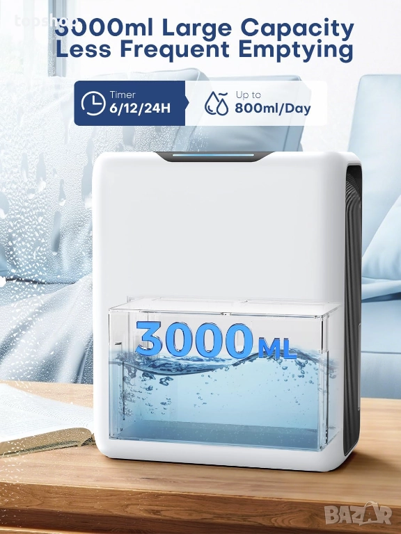 Съвети: За най-добри резултати използвайте влагоабсорбатори в пространства с площ от 5-20 кв.м при температура 15°C-40°C. Уверете се, че вентилационните отвори са свободни за правилен въздушен поток. Редовно изпразвайте резервоара за вода, за да поддържате ефективността и да осигурите дълготрайна работа.