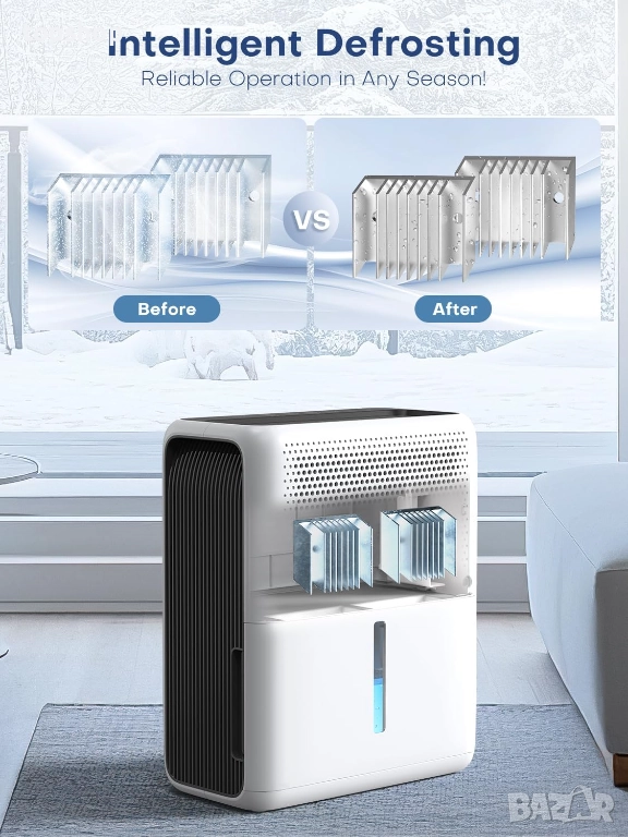 Автоматично размразяване за зимна употреба. В студени условия може да се образува скреж, което намалява ефективността. Функцията за автоматично размразяване открива и премахва скреж, осигурявайки оптимална работа на влагоабсорбатора дори през зимата. Това прави влагоабсорбатора подходящ за целогодишна употреба.