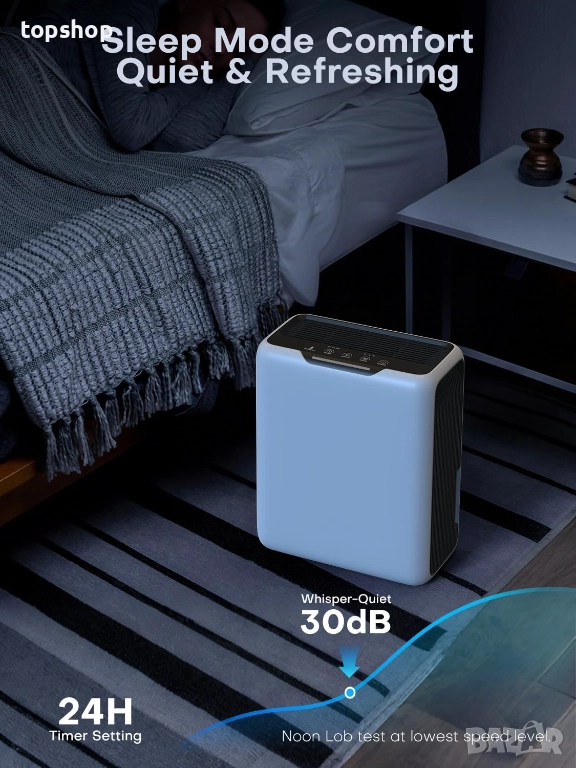 Тих режим на сън, функция таймер: Влагоабсорбаторите, проектирани за нощна употреба, работят в режим на сън само 30dB, осигурявайки минимален шум. Светлините се изключват, за да се избегне безпокойство, а таймерът може да бъде настроен за 6, 12 или 24 часа, като автоматично спира устройството, след като заспите. Тази енергоспестяваща функция е едновременно практична и разумна.