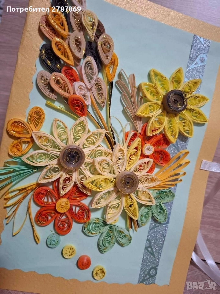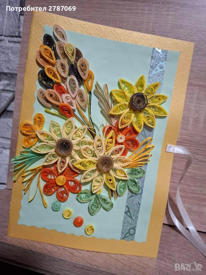 🌟Подарете емоция, която не избледнява. Картичката е изработена изцяло на ръка в техника квилинг – ярки цветя, красиви детайли и пролетно настроение. Перфектна за любим човек.