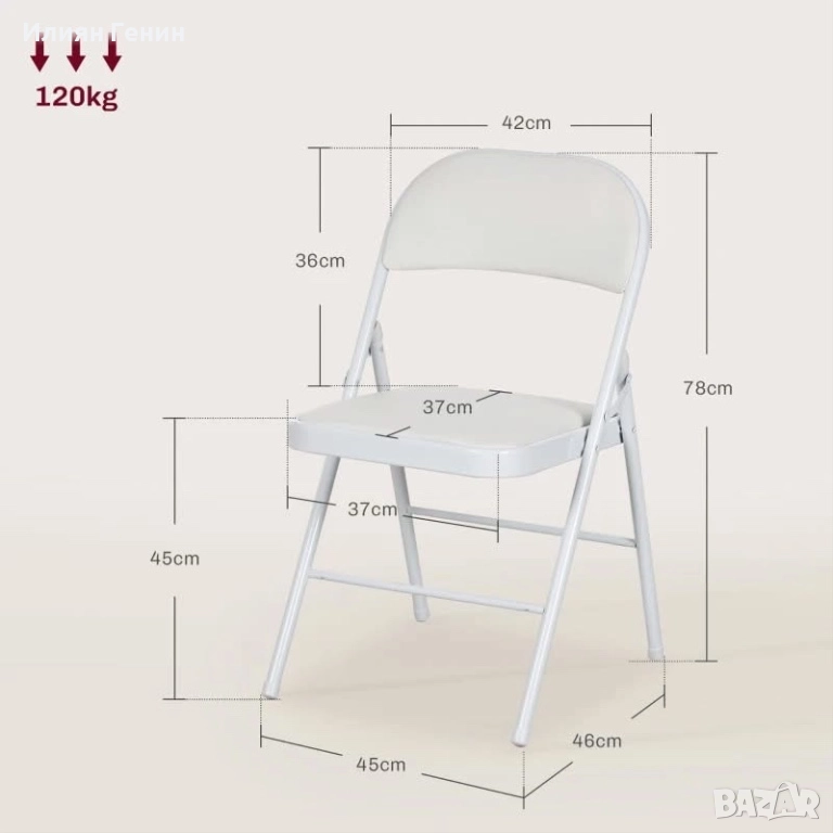 Детайли за продукта: Сгъваеми столове: Общи размери: 45Д x 46Ш x 78В см, размери на седалката: 37Д x 37Ш x 45В см, размери в сгънато състояние: 45Д x 97Ш x 9В см. Не е необходим монтаж.