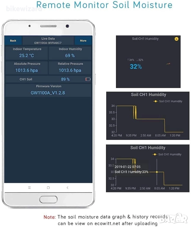 Прецизно измерване: Събира данни за влажността на почвата на всеки 70 секунди, предоставяйки точни показания за оптимална грижа за растенията. Водоустойчивост IP66: Надежден при всякакви метеорологични условия с водоустойчивост IP66, осигуряваща издръжливост на открито. Разнообразни честотни опции: Предлага се в 915MHz (Северна Америка), 868MHz (Европа) и 433MHz (други райони), осигурявайки съвместимост с различни Ecowitt шлюзове. Ace Hardware Moisture Meter | Как Bhyve измерва влажността на почвата | Безжична свързаност: Безпроблемно се свързва с Ecowitt GW1100 Wi-Fi шлюз за наблюдение в реално време чрез WS View Plus или приложението Ecowitt. Многоканална поддръжка: Поддържа до 8 WH51 сензора с GW1100 шлюза, което позволява цялостно наблюдение на влажността на почвата.