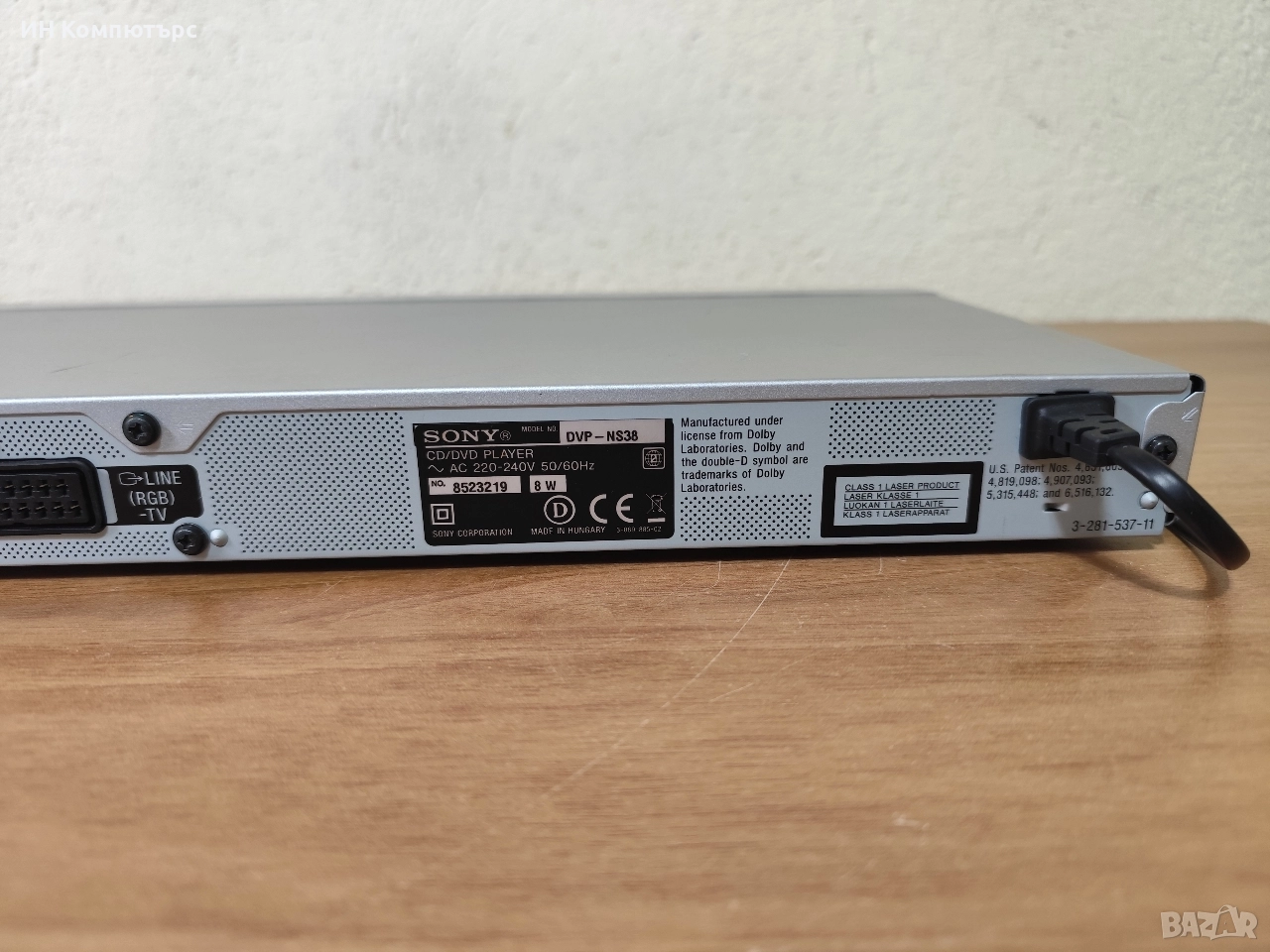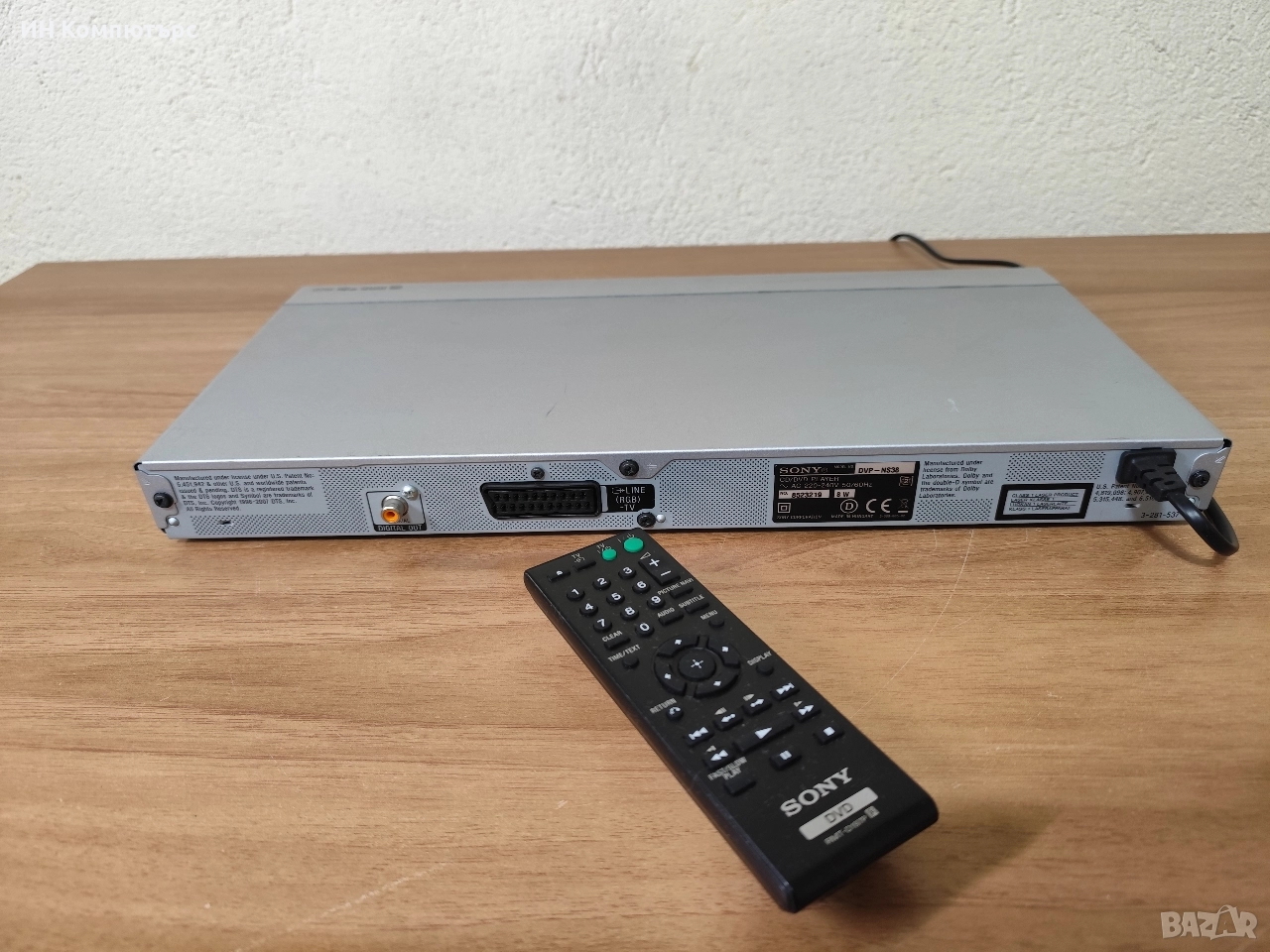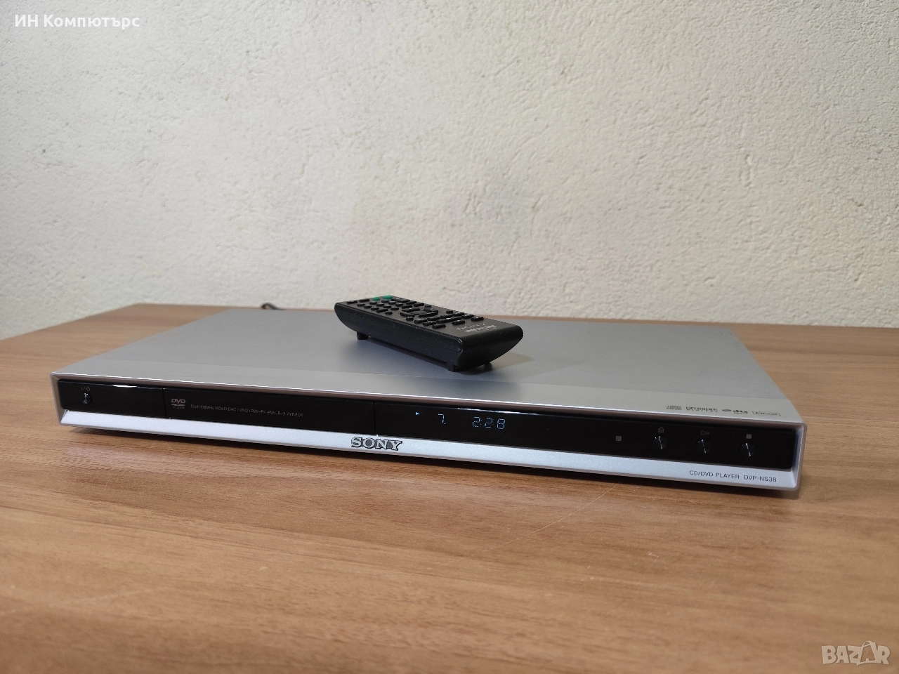 Sony DVP-NS38 DVD‑плеър. Плеърът поддържа DVD Video, Audio CD, VCD, Super VCD, както и DVD‑R / DVD‑RW / DVD+R / DVD+RW / CD‑R / CD‑RW записи.