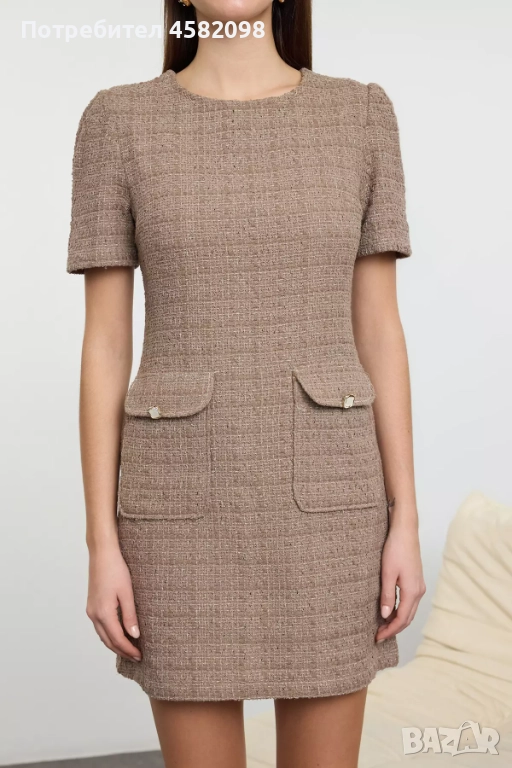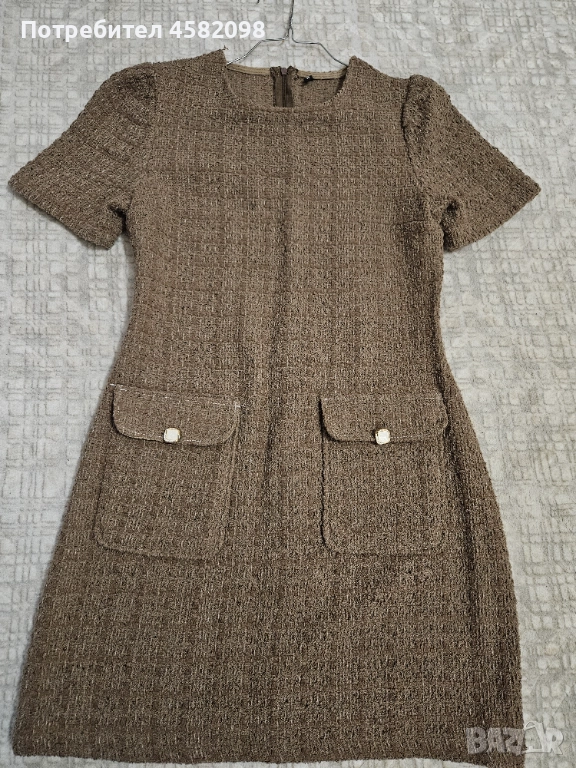 Дамска рокля в модерен шоколадов цвят. Отпред е с джобчета, с елегантни капачета. Плата наподобява букле.