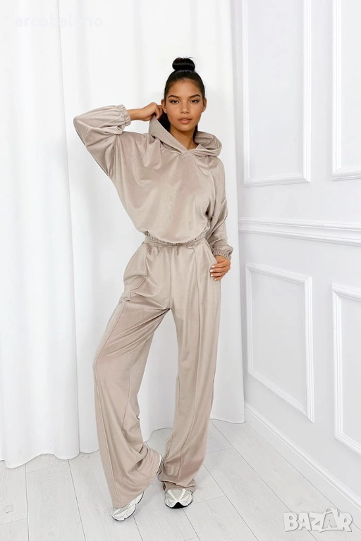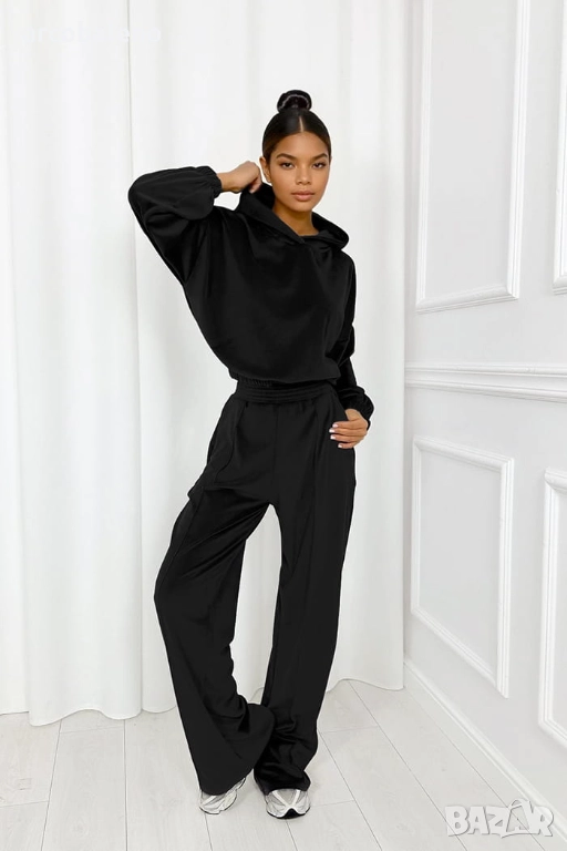Комплект, който съчетава комфорт със стилен, непринуден вид. Късият суичър с качулка, съчетан с широки панталони, създава балансиран тоалет, а качулката и практичният джоб добавят комфорт и непринудено излъчване. Изработен от мек и приятен на допир материал.