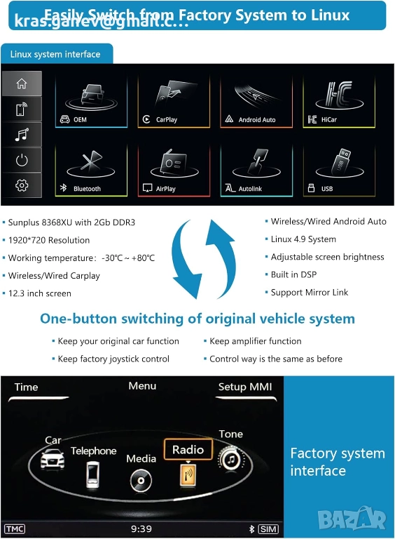 Поддържа се оригинална функция: екранът за надграждане запазва всички оригинални функции, като например: оригинална автомобилна стерео система, функция на усилвател, фабрично управление с джойстик, оригинална камера за задно виждане и заден ход и др. Няма софтуерни промени в блоковете за управление на автомобила. Поддържа AHD 720P задна камера.
