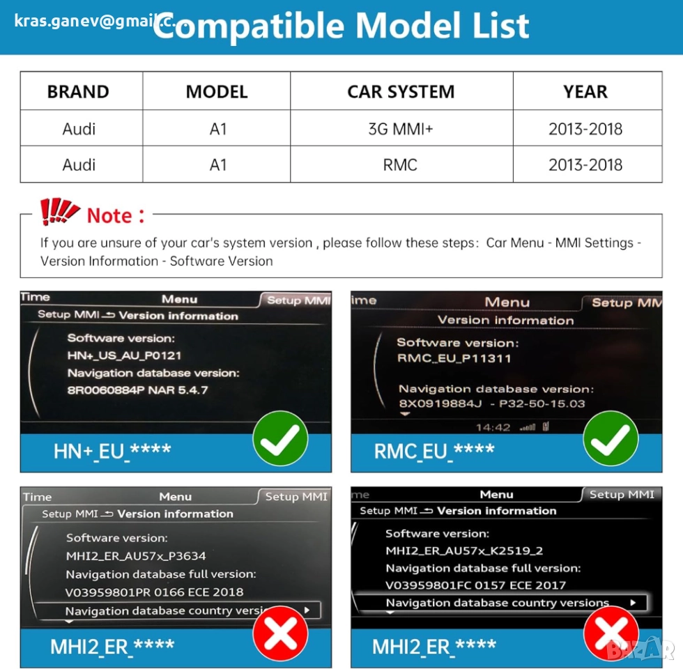 Съвместимо с Audi A1 (модел 2012-2018) с MMI 3G система, съвместимо с Audi A1 (моделни години 2013-2018) с RMC система. Съкращенията в информацията за версията са HN+ за 3G MMI системи и RMC за RMC системи. Можете да проверите системата, както следва (Стартово меню - Настройки на MMI - Информация за версията - Версия на софтуера). Ако не сте сигурни, моля, изпратете ни снимка на версията на системата.