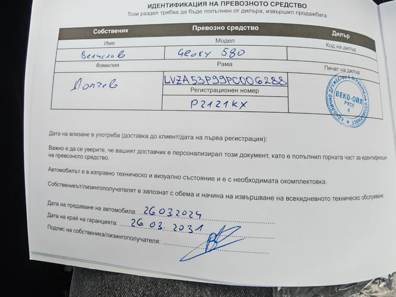 Автомобилът е закупен от официалния дилър на Донгфенг за гр. Русе- Веко Ойл. В гаранция е до 26. 03. 2031 год. или 150 000 хил км / което настъпи първо/. Направени са първите две обслужвания, третото е планувано на 30 000 км или месец юни 2026. Платени, данък, каско ГО и винетка до 26 март 2026 год. Състоянието на автомобилът е неразличимо от ново, няма точица или драскотина по интериор и екстериор. Не е завеждане щета по каско и няма за завеждане. Поставено е висок клас фолио на предни фарове, затъмнени стъкла с оставаща гаранция 4 год. на фолито.