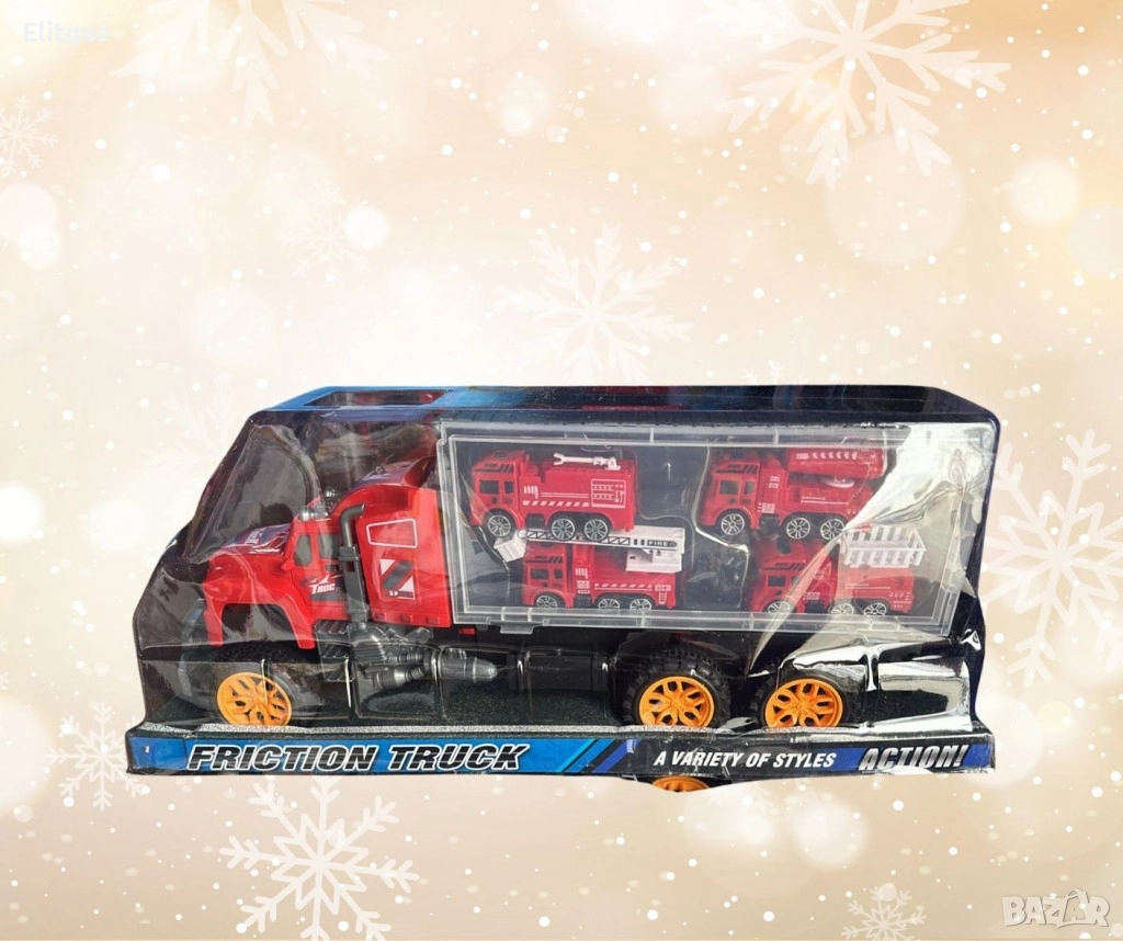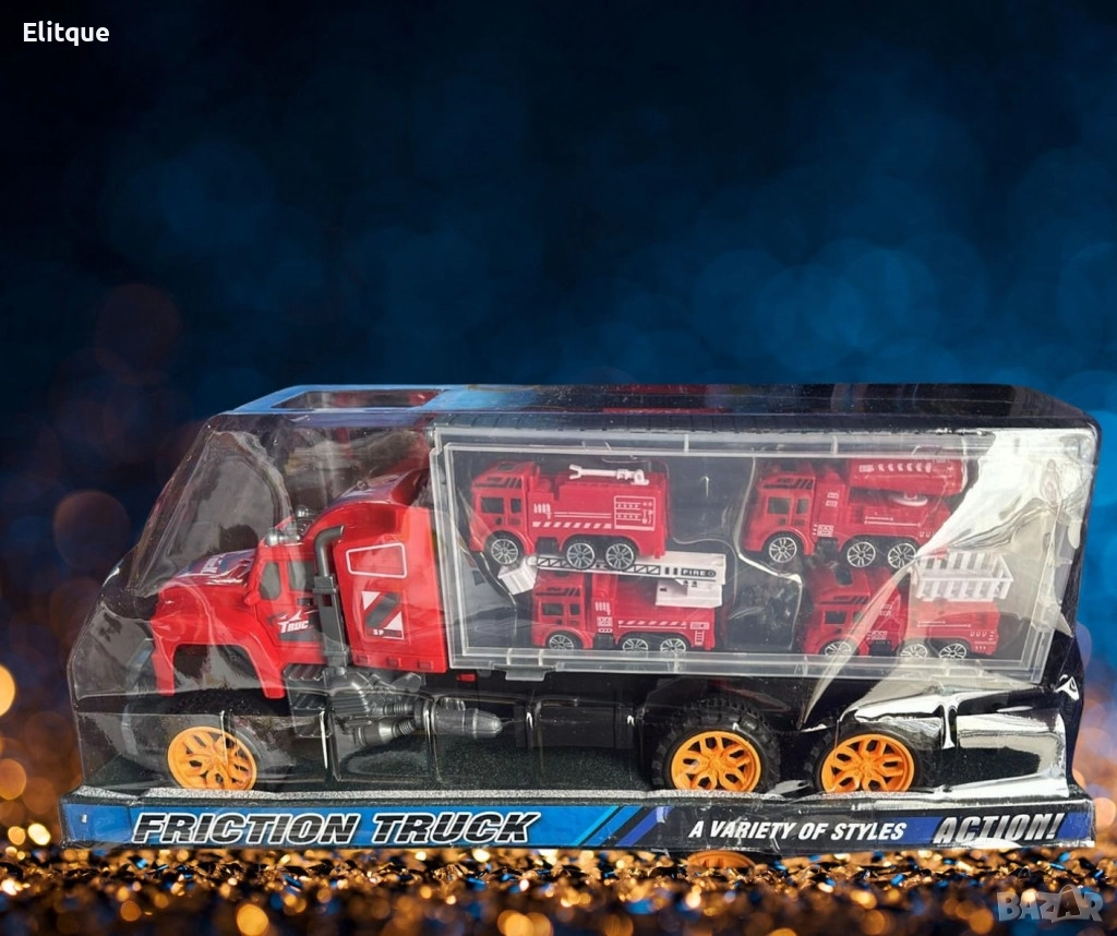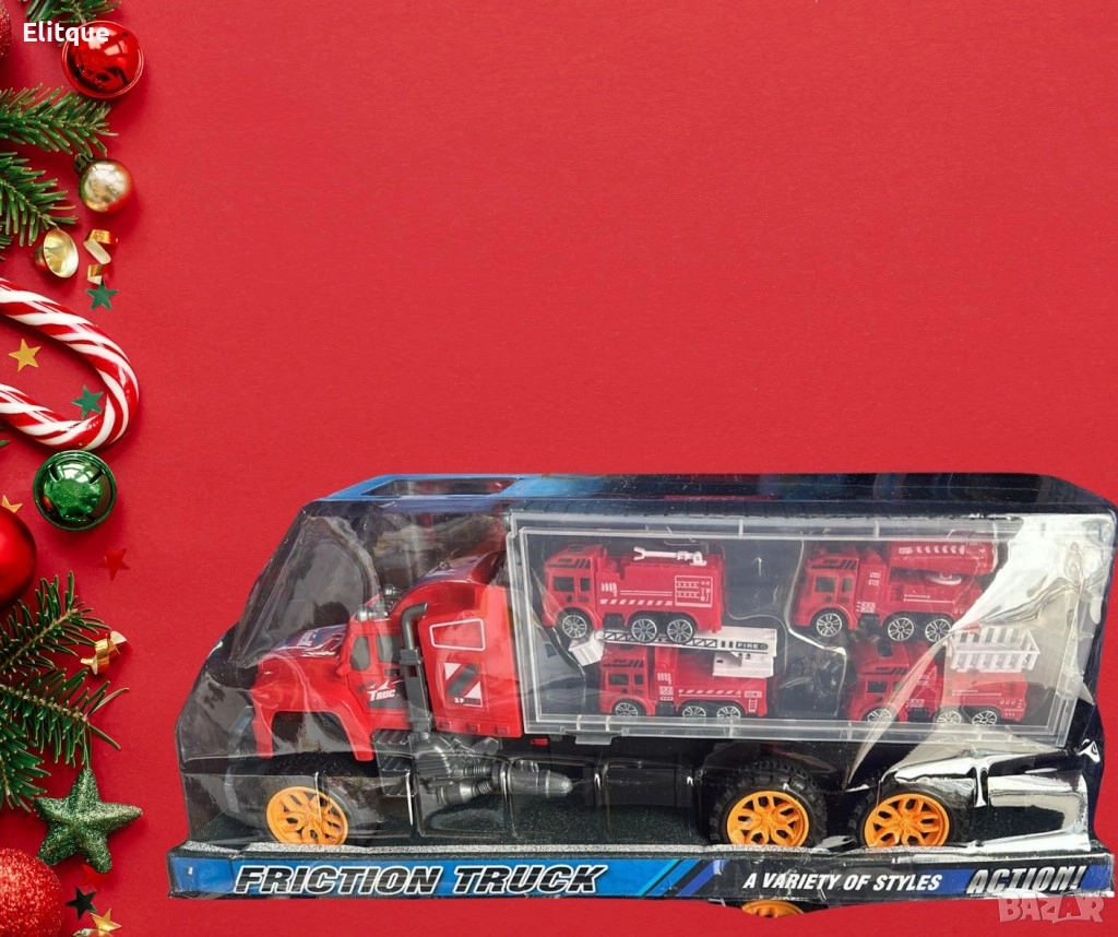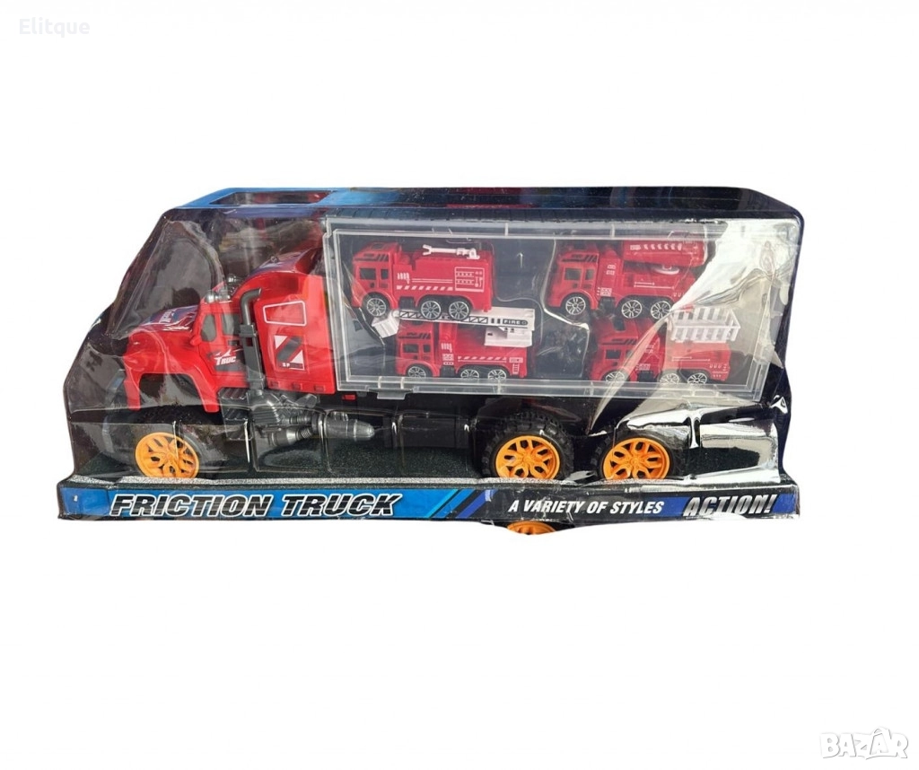 автовоз с пожарни коли Размери: 50 см (дължина) х 19 см (ширина) х 10 см (височина) Цветен и атрактивен камион автовоз, който може да превозва включените в комплекта пожарни коли. Подходящ за деца, които обичат играта с превозни средства и искат да развиват въображението си. Камионът е изработен от безопасни материали и е устойчив на удари. Характеристики: Комплектът съдържа 1 автовоз и 4 пожарни коли Подвижни части – камионът може да транспортира и паркира пожарни коли; Идеален за ролеви игри, които развиват моториката и координацията.; Ярки цветове и реалистичен дизайн; Продуктът е подходящ за деца над 3 години.