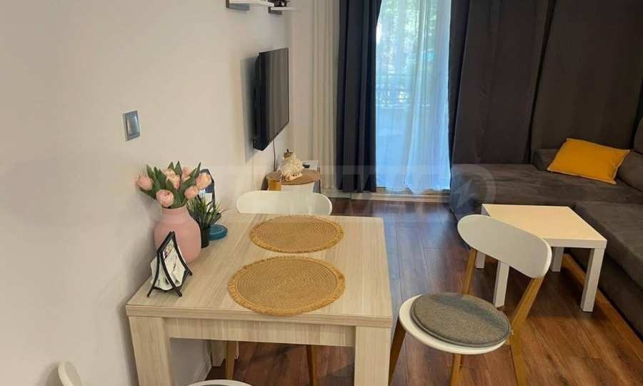 Жилището се намира на 1-ви етаж, напълно обзаведено и оборудвано, готово за нанасяне. Пространството е разпределено функционално между светла дневна с напълно оборудван кухненски кът, зона за хранене, кът за отдих, обособена спалня , баня и тераса. Панорамните прозорци осигуряват естествена светлина през целия ден и създават усещане за простор.