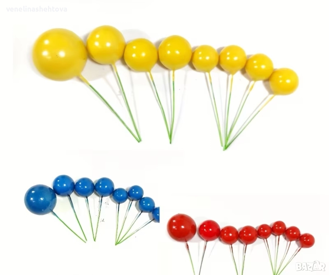 24 броя топчета топки на тел от стиропор за декорация на торта червен син жълт цвят → Обява 52702017