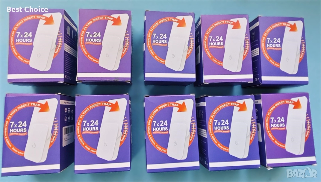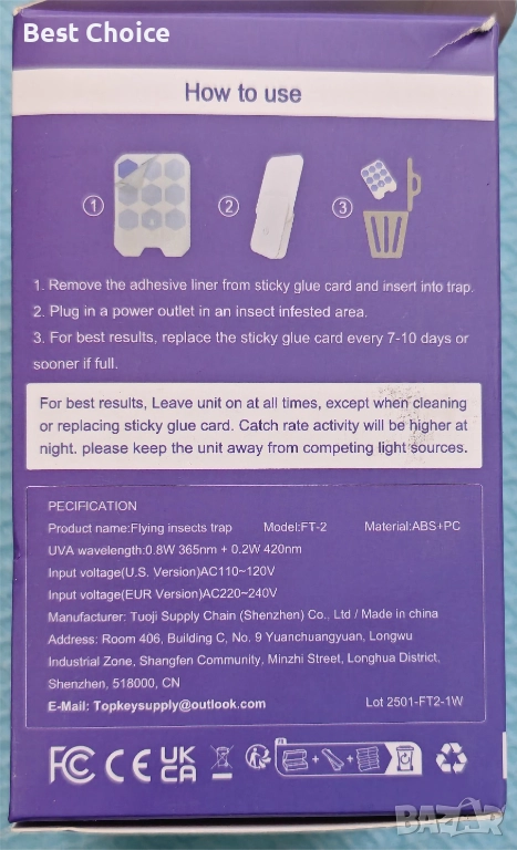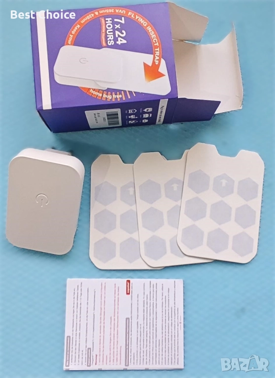 Принцип на действие: Устройството привлича насекомите с комбинация от синя и UV светлина (UV-A) и ги улавя върху сменяема лепяща подложка, разположена вътре в корпуса.
