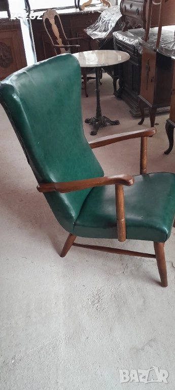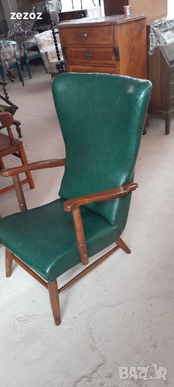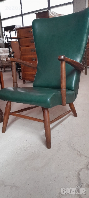 Ретро кресло,дъбов масив.Скандинавски дизайн.Mid-Century-Modern.От средата на 20 век.Висок и извит гръб-тип "крило".Креслото е със система от пружини и е много удобно.Изкуствена кожа.Конструктивно здраво.Забележки по кожата получени при транспорта-видими на снимките.Размери-