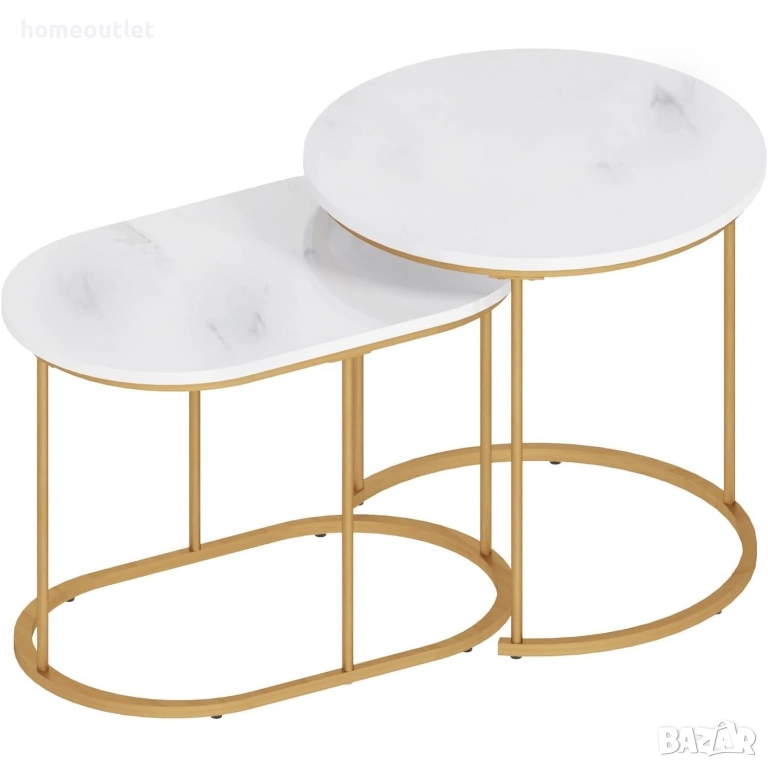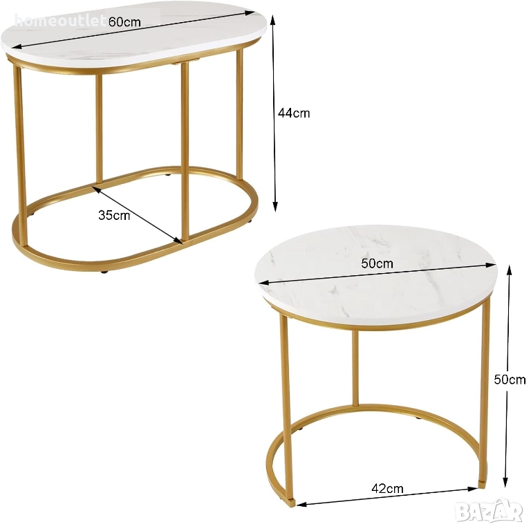 Комплектът включва кръгла маса с размери: 50 см дължина x 42 см ширина x 50 см височина и елипсовидна маса с размери: 60 см дължина x 35 см ширина x 44 см височина, предоставяйки ви разнообразни опции за подобряване на пространството във вашата всекидневна, спалня, офис, хол, антре или всяко друго място, което се нуждае от елегантен щрих.