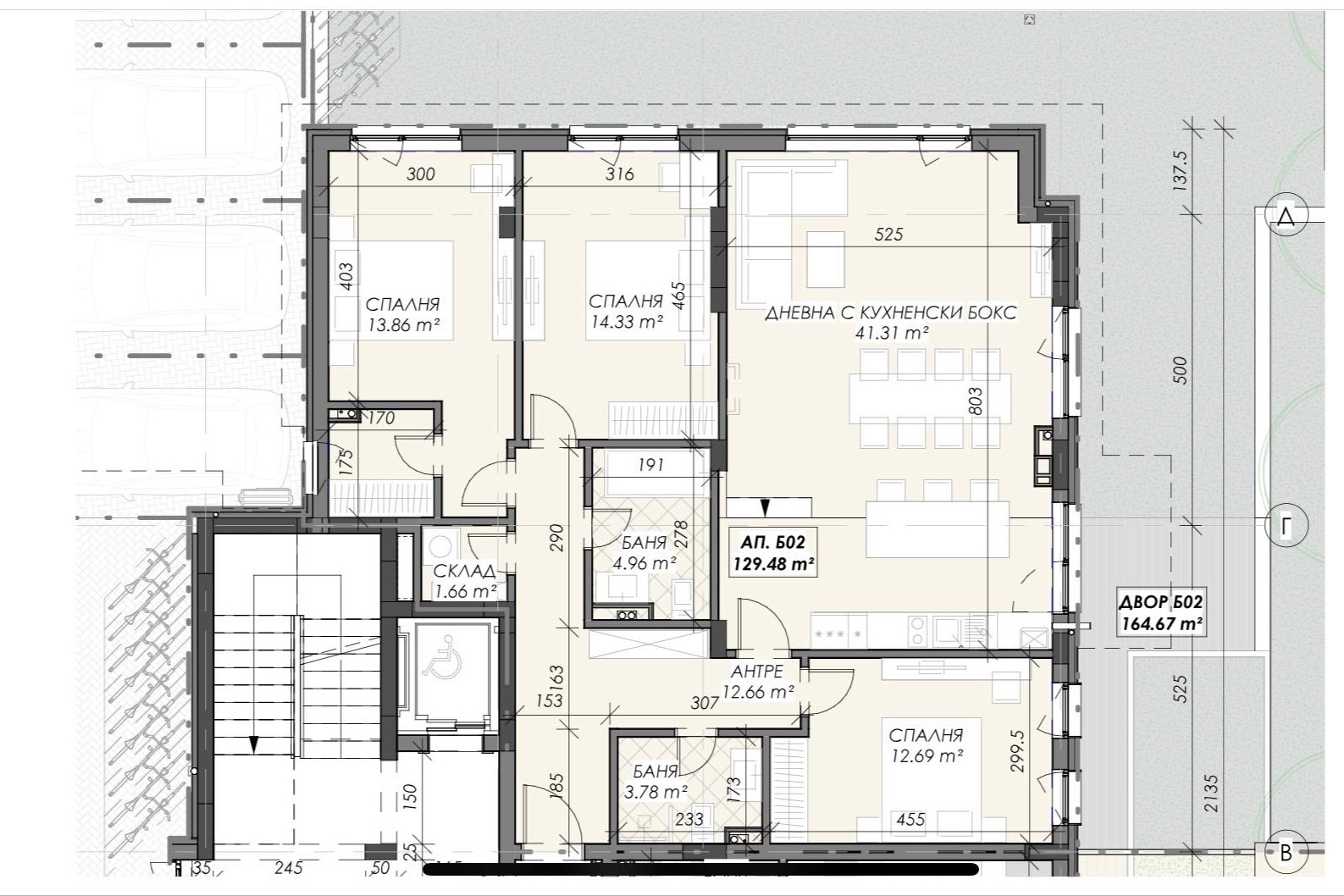 Четиристаен апартамент с двор, жилищна площ 150 кв.м. + 165 кв.м. двор. Състои се от: предверие, просторна дневна с трапезария и кухненски бокс (светла височина 340 см.), с излаз на собствен двор, 3 отделни непреходни спални (светла височина 315 см.), 2 бани с тоалетни, мокро помещение.