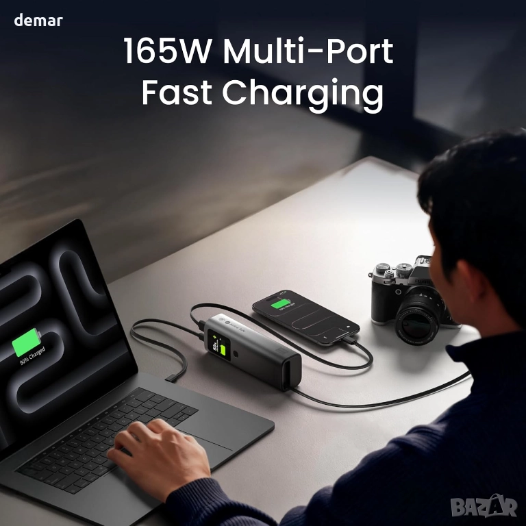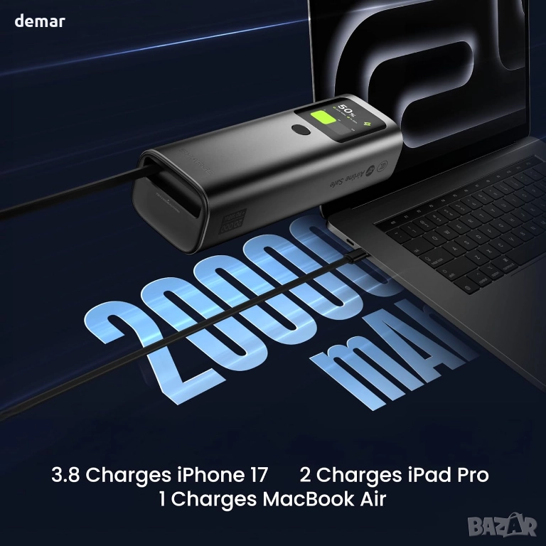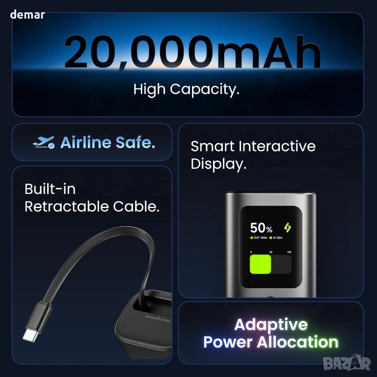 Това устройство осигурява бързо 165W многопортово зареждане за до три устройства едновременно и включва капацитет от 20 000 mAh, за да поддържа телефони, таблети и лаптопи заредени по време на дълги дни или пътуване. Разполага с вграден прибиращ се 70 см кабел за удобство без претрупване и интелигентен 2,01-инчов дисплей, показващ температура, мощност и състояние на зареждане. Алуминиевата сплав и огнеупорната PC конструкция повишават издръжливостта и контрола на топлината, а широката поддръжка на протоколи за бързо зареждане осигурява широка съвместимост. Одобрено е и от авиокомпании, което го прави подходящо за пътувания и ежедневна употреба.