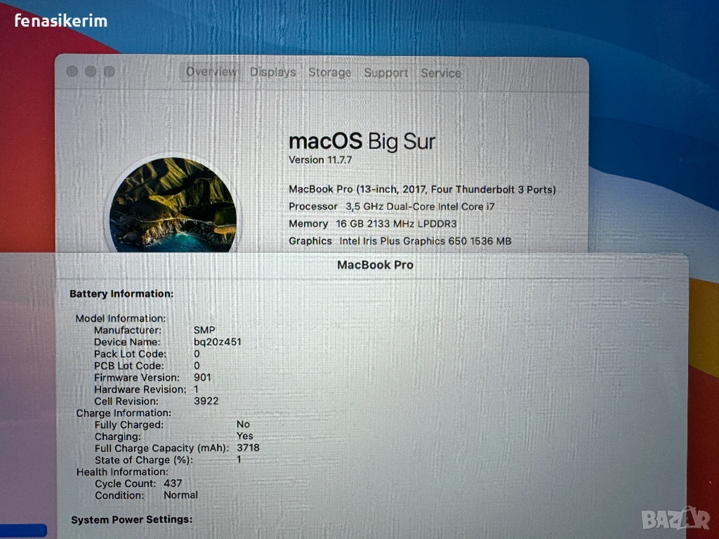 Здравейте. Продавам поръчков CTO MacBook Pro 13 Mid 2017 Toucbar, поръчан във варианта с най-мощния за платформата Core i7 3.5GHz процесор, 16GB RAM и голямото 512GB SSD. Mакбука е в добро визуално състояние, с нормални следи от употреба за времето си и е в безупречна техническа кондиция. В комплект със зарядното у-во и кабел Type C. Батерията е на 440 цикъла и издържа до 5 часа. Чисто нова инсталация на Mac OS, преди пускане на обявата, без акаунти, iCloud пароли и т.н.