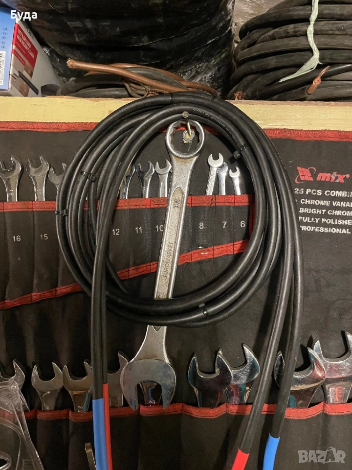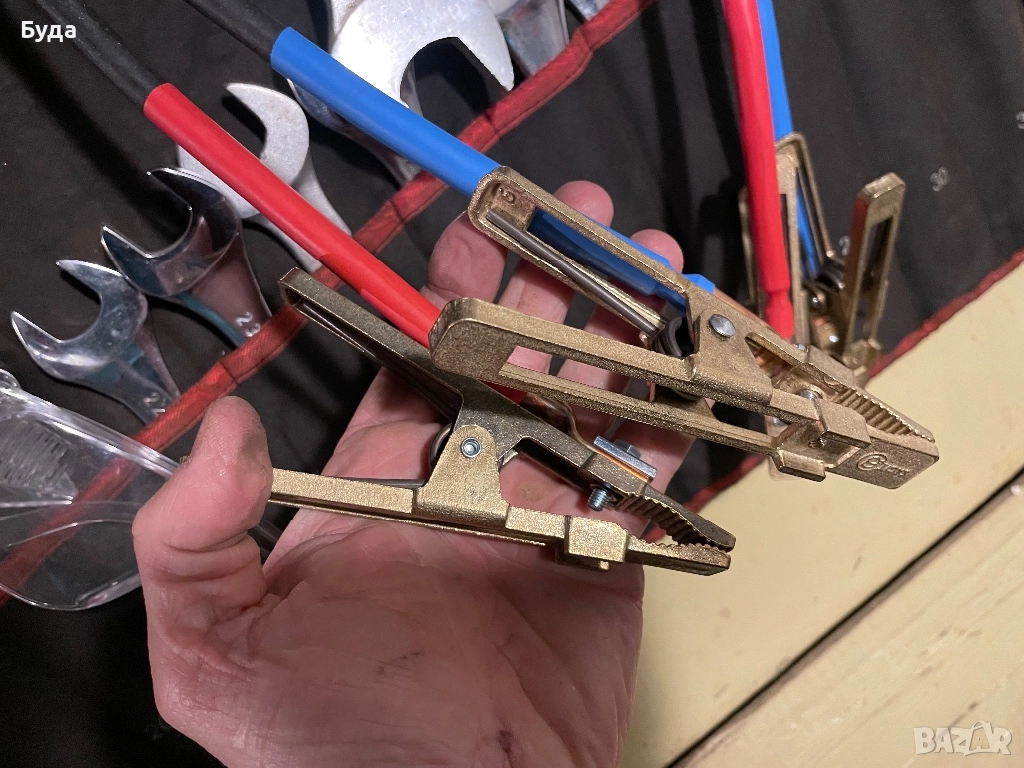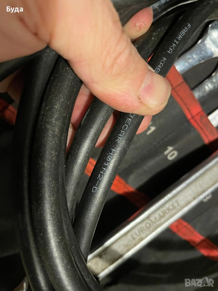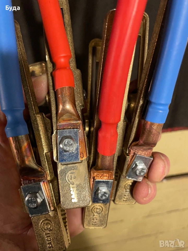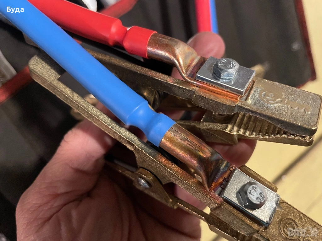 Кабели за подаване на ток, с обща дължина заедно с щипките 3.45 метра . Сечение 25 кв , кабел електроженен мек и гъвкав такъв какъвто трябва да бъде, със запоени дебели медни обувки и бронзови щипки. Много качествено направен !