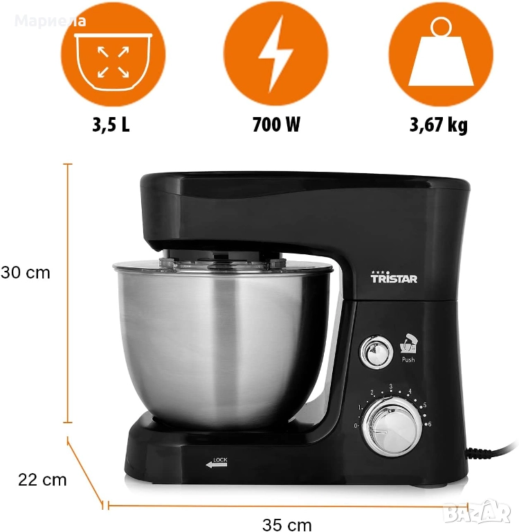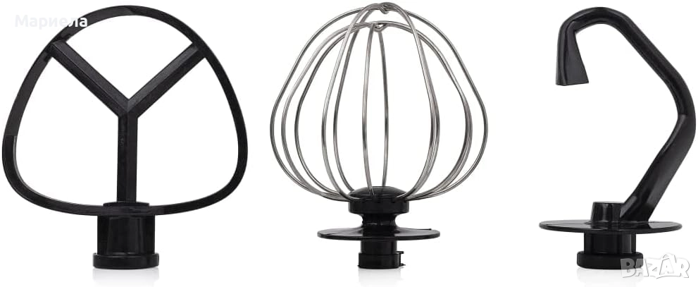 Включва бъркалка за яйца, кука за месене и плоска бъркалка за приготвяне на всякакви видове тесто.